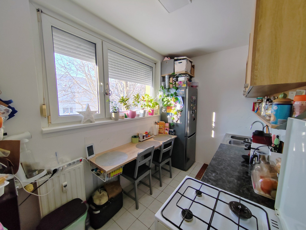 A konyha szép állapotú , keleti fekvése és nagy méretű műanyag nyílászárói által napfényes, a virágok jól érzik magukat ebben a lakrészben.