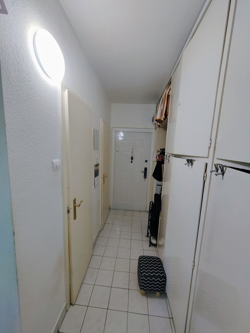 A közlekedőben beépített szekrények biztosítják a helyet a pakolásnak.