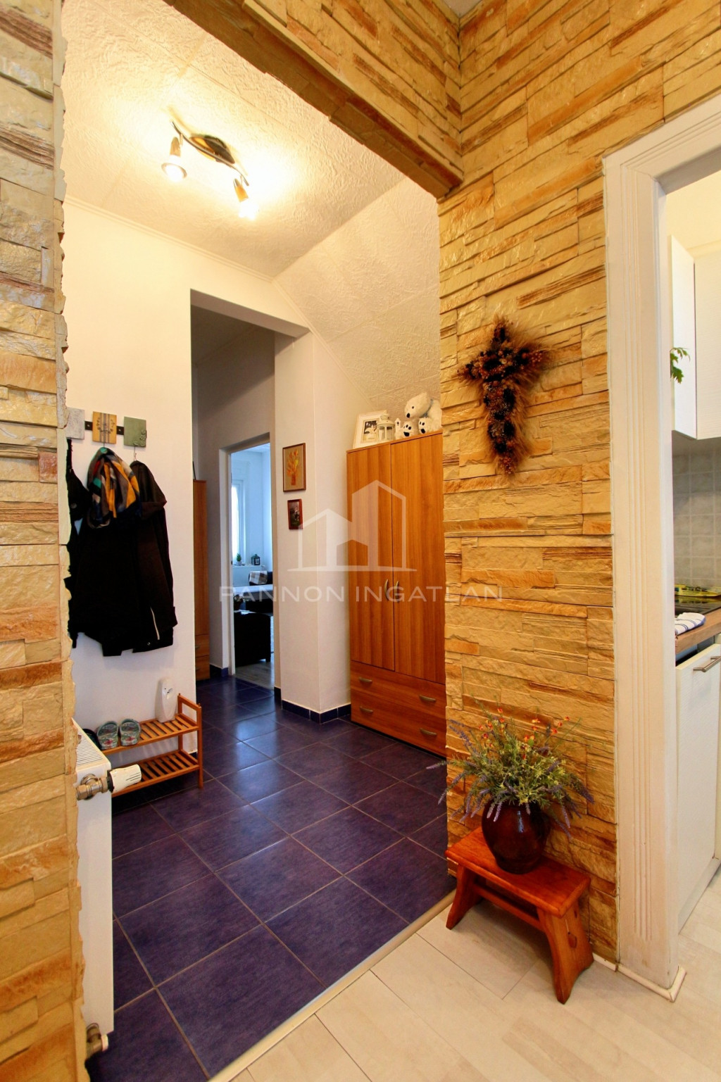 A lakás zárt lépcsőházból, azon belül pedig egy külön kis folyosóról nyílnak. Erről a kis folyosóról, közös előszobából ezen ingatlanon kívül még egy lakás nyílik.