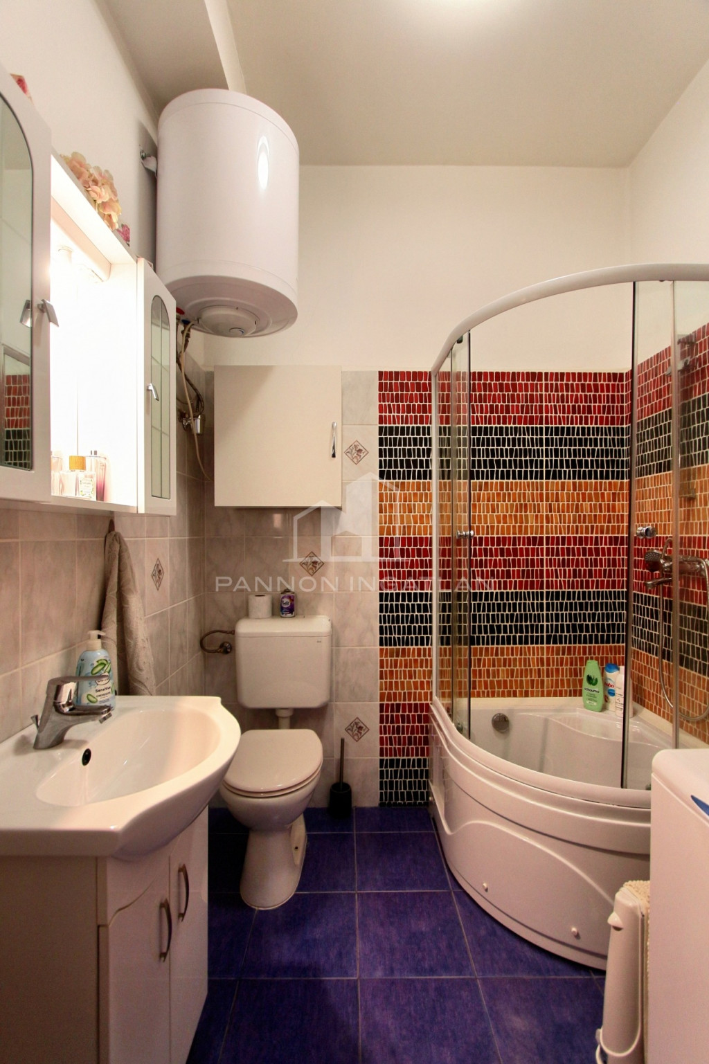 A fürdőszobában ülőkádas zuhanykabin található.