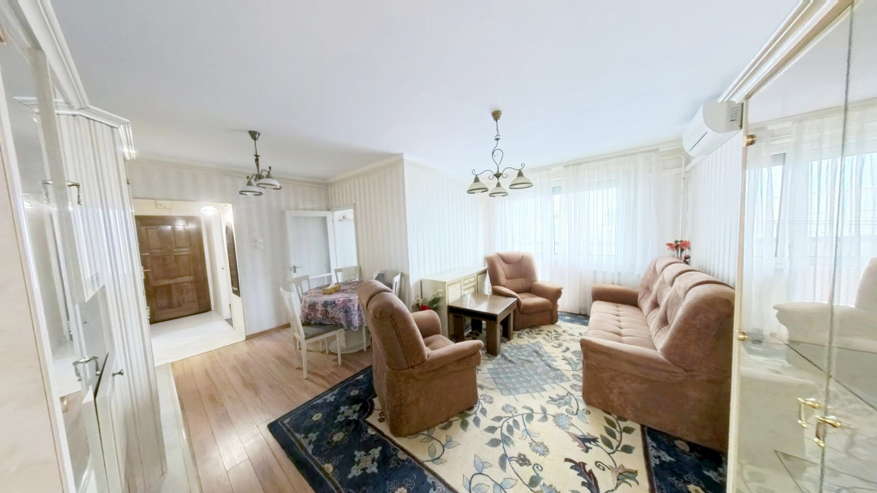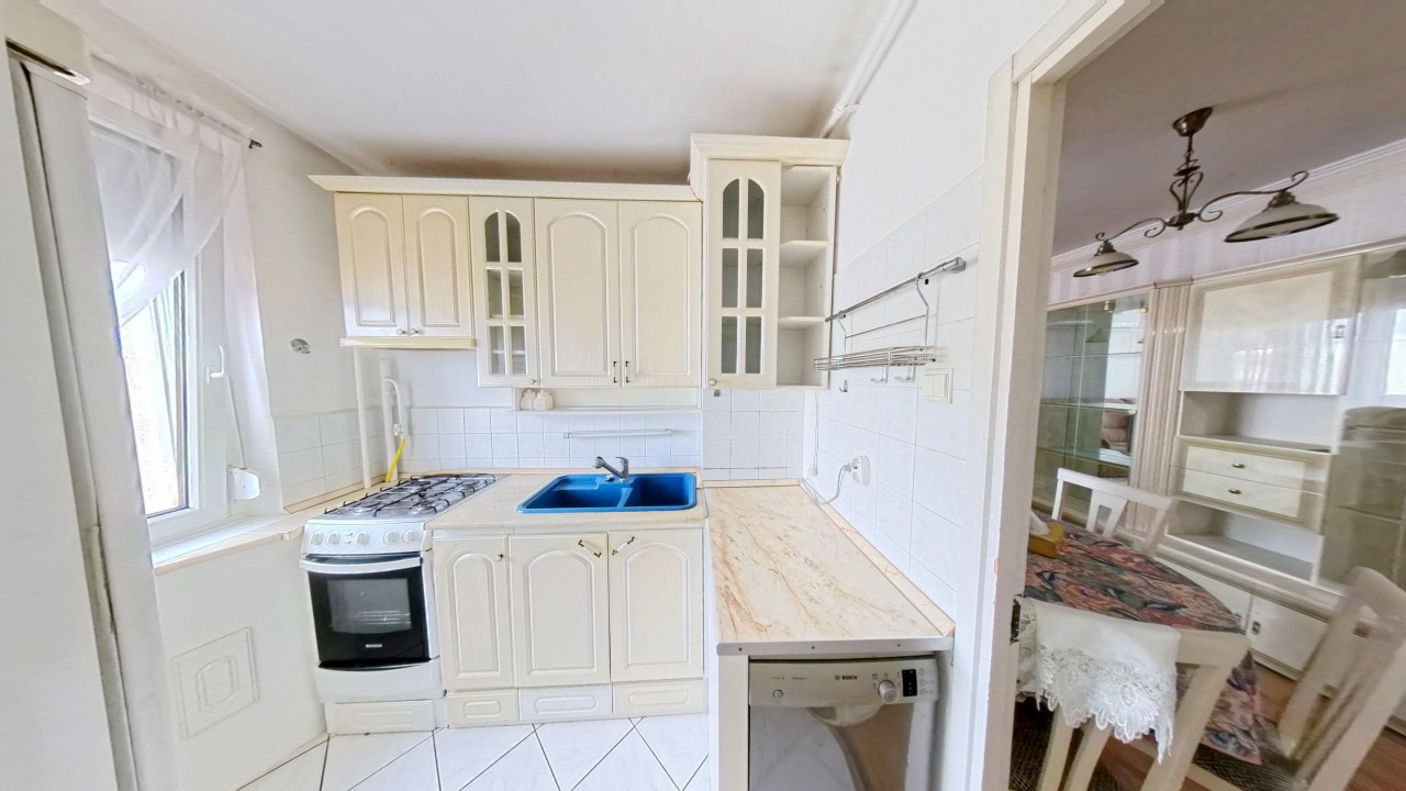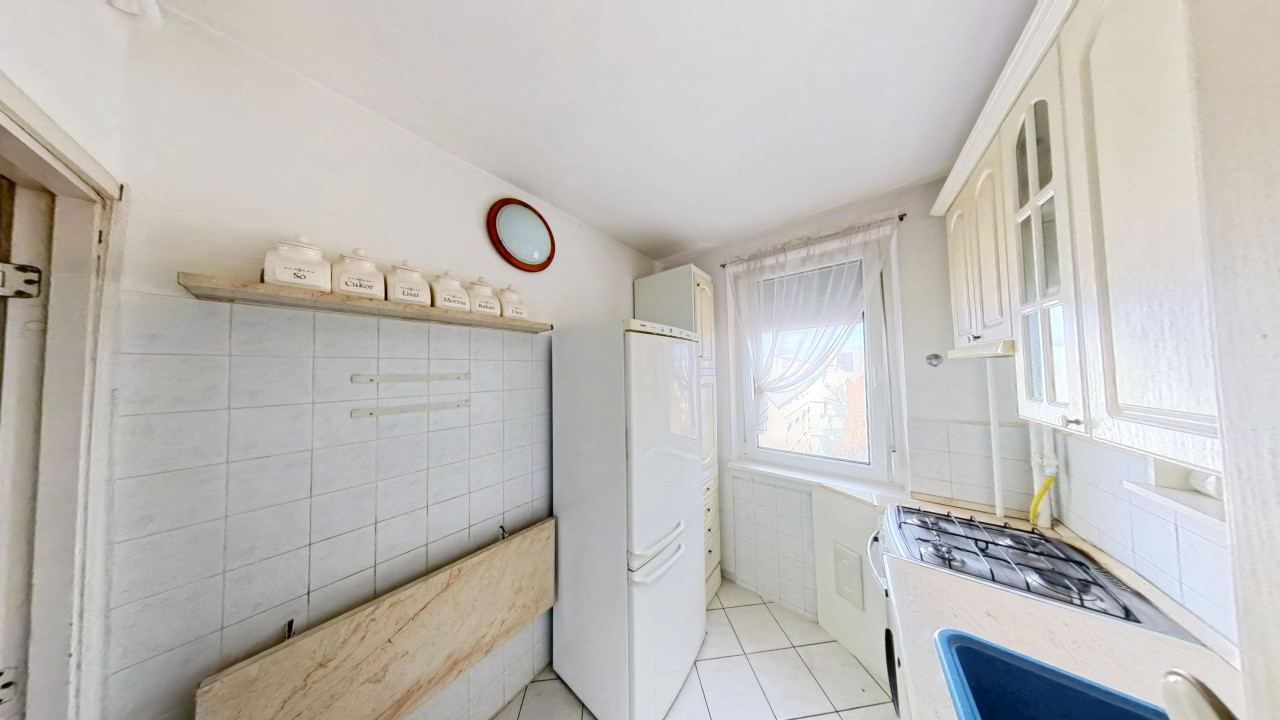 A közlekedőből nyílik a fürdőkádas fürdőszoba. Ebben a közlekedőben is mennyezetig érő beépített szekrény segíti a holmik tárolását. Az ablakokat, az erkélyajtót HŐSZIGETELT MŰANYAG NYÍLÁSSZÁRÓKRA cserélték, melyeket ALUMÍNIUM REDŐNNYEL, szúnyoghálóval is elláttak. A nappaliban, 2 hálószobákban laminált lap, 1 hálószobában szőnyegpadló, a konyhában, fürdőben, WC-ben, a közlekedőkben kerámia a padló burkolat.