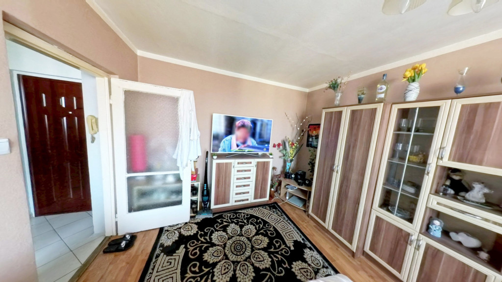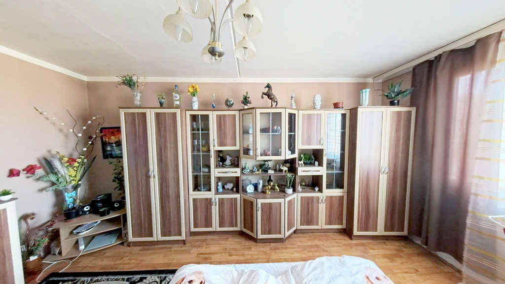 A lakásba belépve egy előtérbe érkezünk, ahonnan balra nyílik a valóban tágas, világos szoba. A szoba külső falait belülről 3 cm-es hőszigeteléssel látták el. A szobából kitekintve pompás BAKONYRA NÉZŐ PANORÁMA tárul elénk. Vele szemben van a fürdő. A bejárattal szemben a már említett konyha-étkező kapott helyet. A szoba ablakát már kicserélték hőszigetelt műanyagra, konyhai még az eredeti. A szoba laminált lappal van burkolva, a többi helyiség járólapos. A fűtés HŐMENNYISÉG MÉRŐVEL van ellátva, melynek díja télen 14 500,- forint, nyáron 4 500,- forint havonta. A BEJÁRATI AJTÓT több ponton záródó, ÚJ BIZTONSÁGI ajtóra cserélték.
