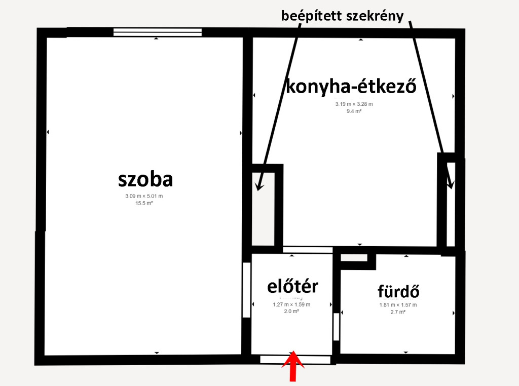 A hetedik emeleti, nyugati fekvésű lakás ELRENDEZÉSE KÜLÖNLEGES, hiszen az átlagos 1 szobás garzonokhoz képest itt egy TÁGAS, VILÁGOS KONYHA-ÉTKEZŐ helyiség is van, melyben 2 db mennyezetig érő BEÉPÍTETT SZEKRÉNY is rendelkezésre áll.