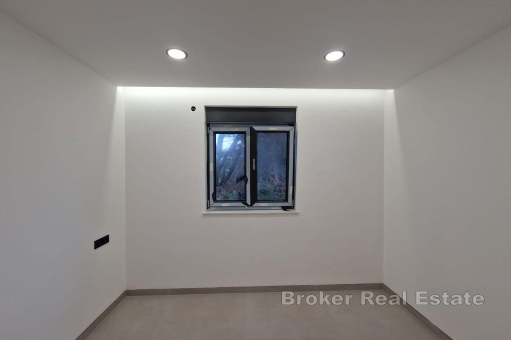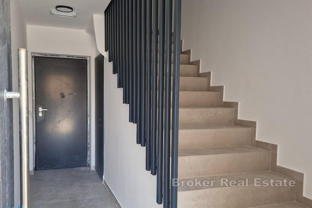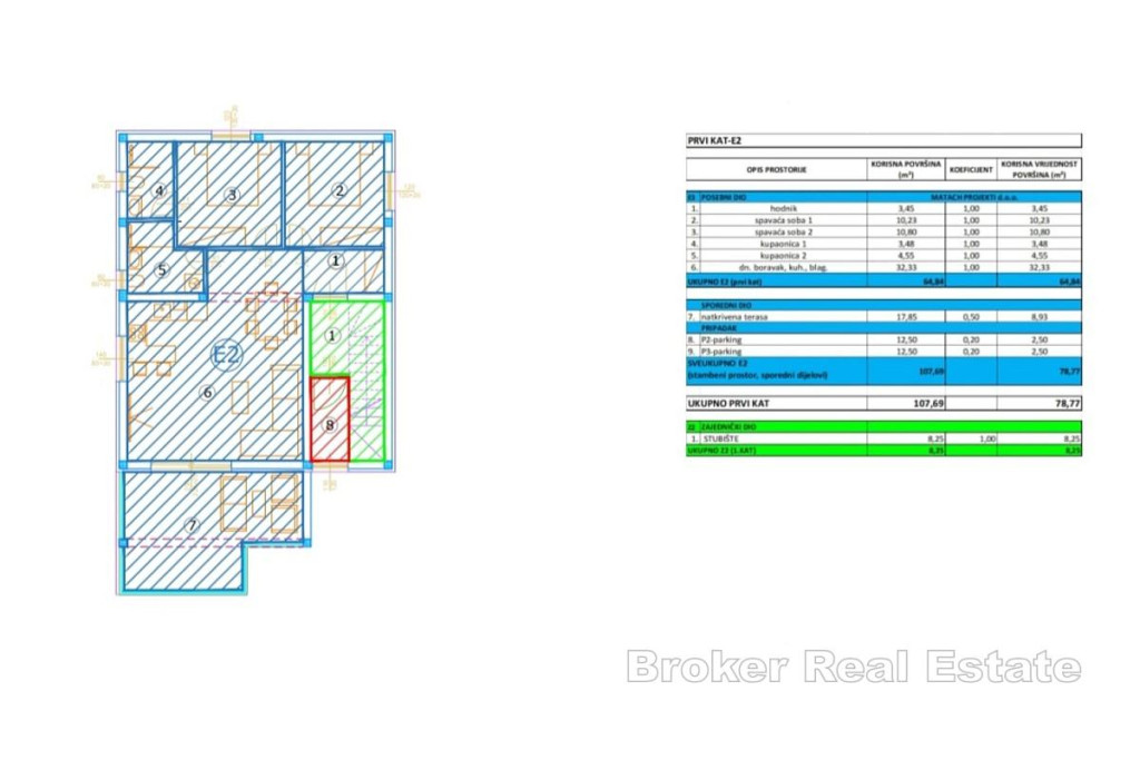 For sale is a new building in the center of Vir, an apartment located on the first floor of a residential building with three residential units, one apartment on each floor. The location is extremely quiet, in a dead end street, and at the same time close to the center of the town and the main beach Jadro. The apartment is south-facing, and the spacious terrace offers a view of the sea. The interior layout consists of a hallway, two bedrooms, one of which has its own bathroom, an additional bathroom, a kitchen, dining room and living room connected in an open concept, and a terrace as an extension of the living space. The apartment has a storage room located under the stairs, also intended for a washing machine, as well as two parking spaces. The apartment was built using modern techniques and quality materials, and the finishing was carried out at a high level. It is equipped with anthracite-colored PVC joinery with triple-layer glass, electric shutters and mosquito nets, aluminum entrance doors to the building and a facade with ten centimeters of thermal insulation. The terraces and the exit to the roof terrace are covered with travertine stone, and the protection is provided by a tempered glass fence. The entire apartment is fitted with large-format ceramics, while the bathrooms are fitted with sanitary equipment from renowned manufacturers. The complete bathroom furniture is custom-made, and for greater comfort, electric underfloor heating is provided. Air conditioning units are installed in the living room and bedrooms, and the apartment has a burglar-proof and fire-resistant entrance door, as well as a video intercom. BROKER REFERENCE ID:1026/35