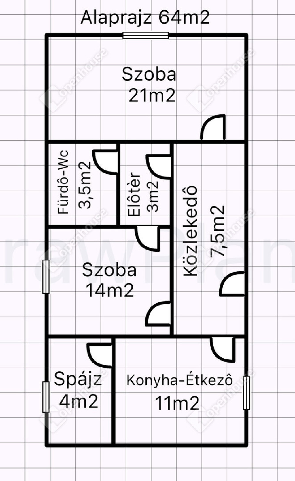 -Helyiségek 64m2 alapterületen: kettő szoba, konyha-étkező, spájz, előtér, közlekedő, fürdő-wc.