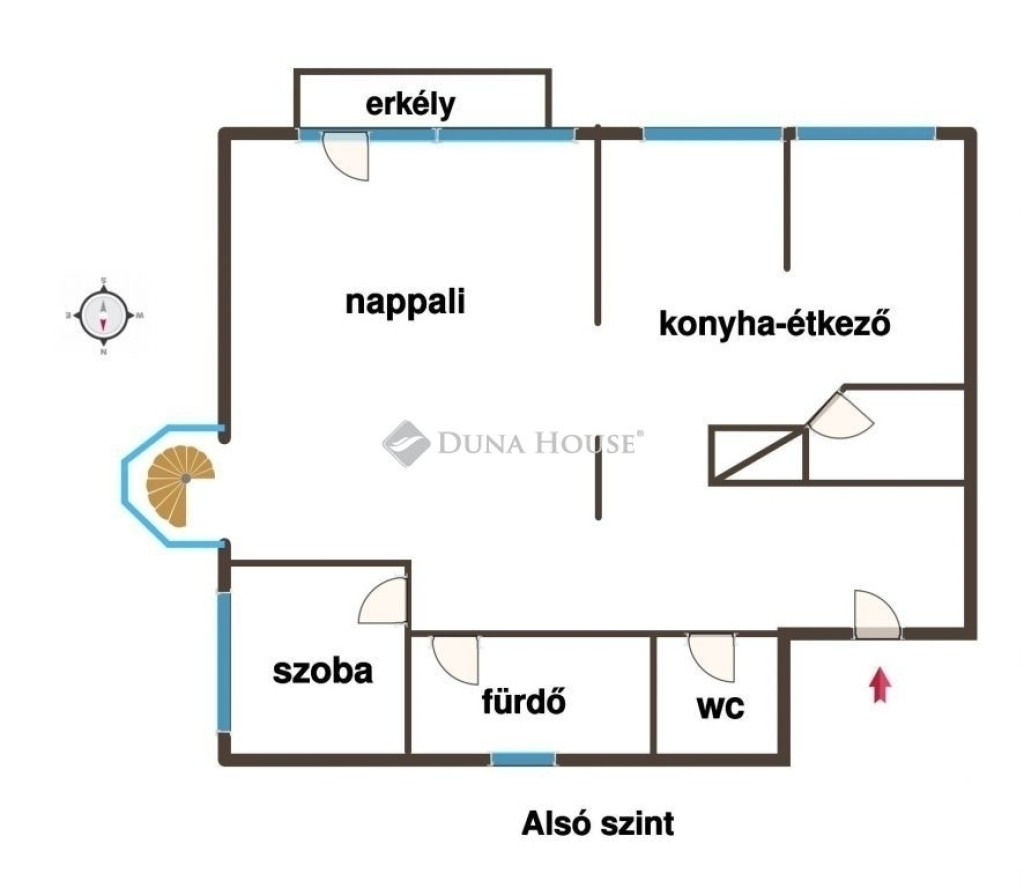 Az alsó szint:-előszoba beépített szekrényekkel-vendég wc-fürdőszoba-tágas konyha-étkező-kényelmes nappali cserépkályhával-kamra-szoba-erkély