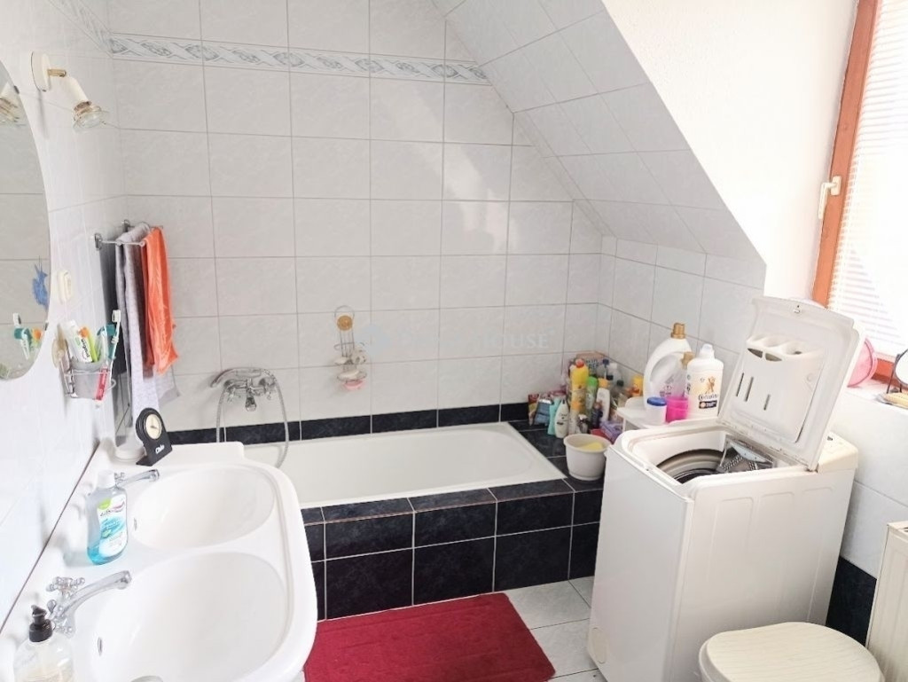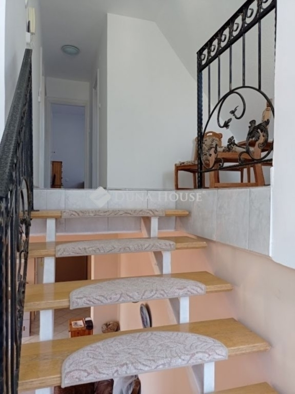 Az alsó szint:-előszoba beépített szekrényekkel-vendég wc-fürdőszoba-tágas konyha-étkező-kényelmes nappali cserépkályhával-kamra-szoba-erkély