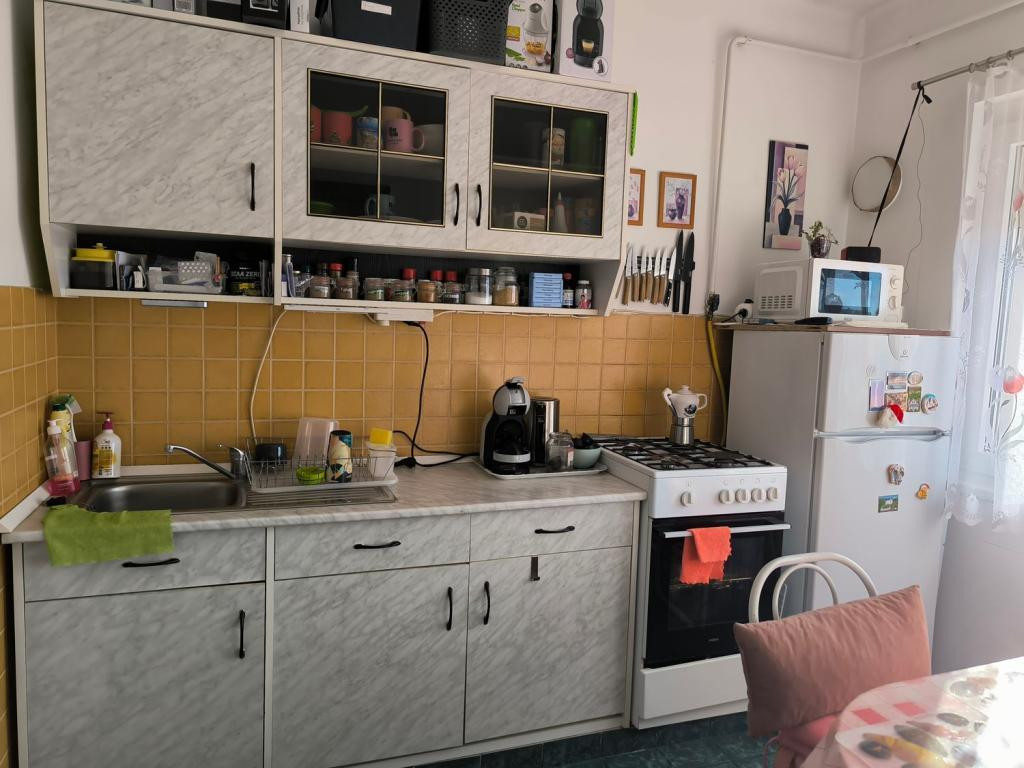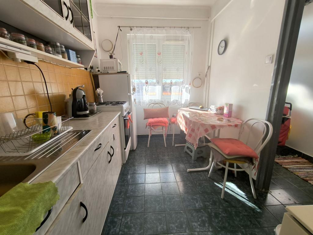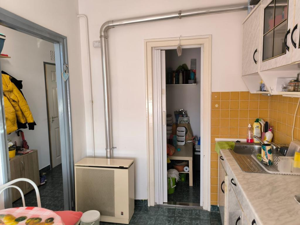 a lakás beosztása: közlekedő, konyha, kamra, fürdőszoba, toalett, szoba, szoba