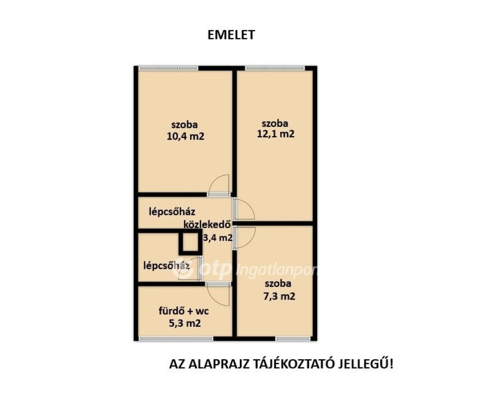 Az emeleten három hálószoba, valamint egy fürdőszoba káddal és WC-vel kapott helyett.