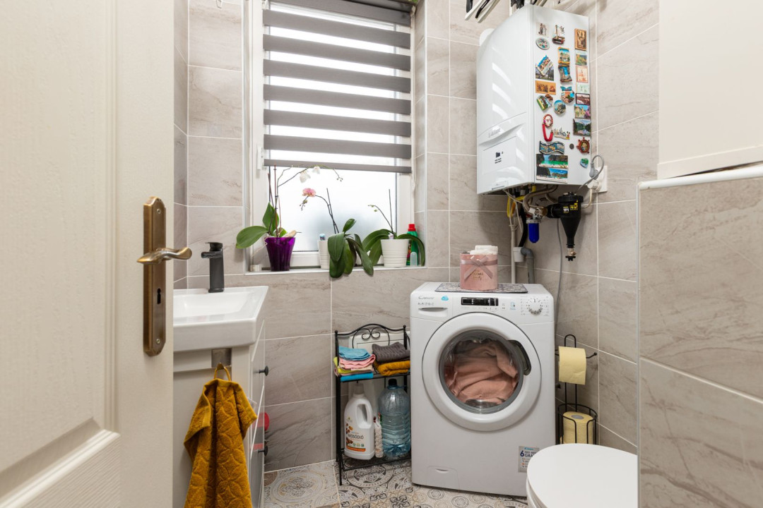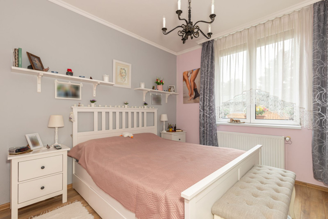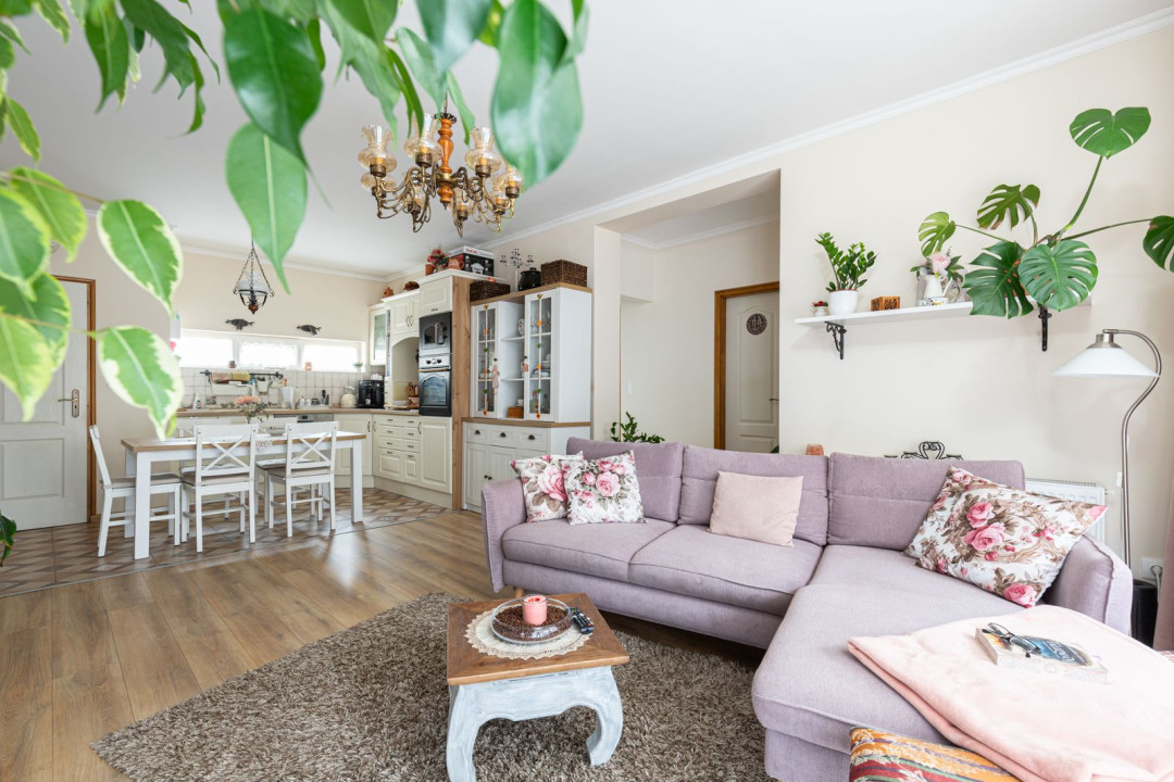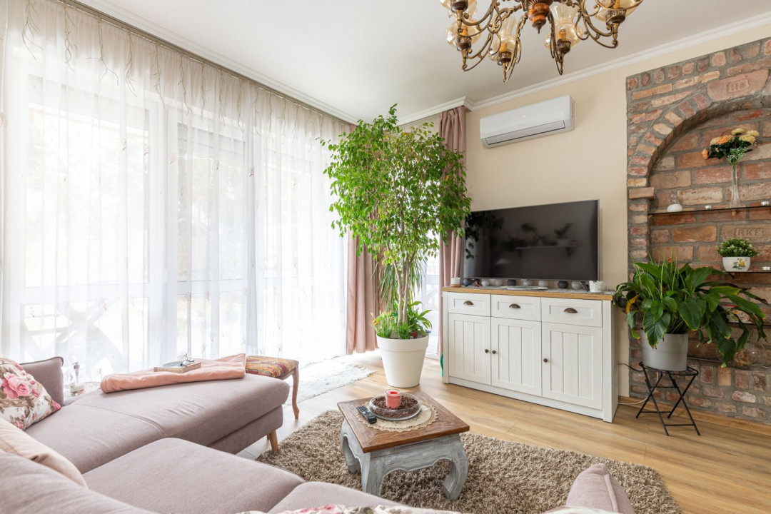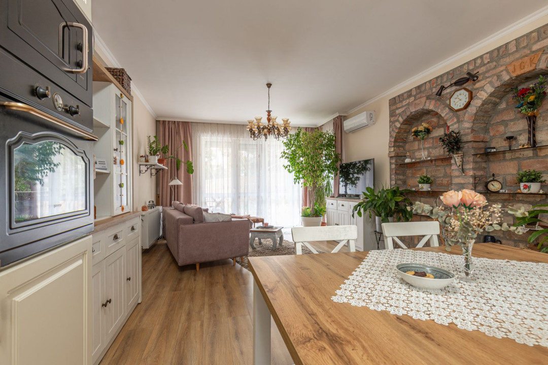 Az ingatlan nappali + 2 hálószobás elosztású, a hálók a lakás két végében kaptak helyet, ami ideális elrendezést biztosít akár családnak, akár otthoni munkavégzéshez. A nagyobb hálóhoz külön leválasztott gardróbrész tartozik. A fürdőszoba modern, zuhanyzós kialakítású, mellette egy tágas, kézmosóval ellátott külön WC és egyben háztartási helyiség került kialakításra, ahol a mosógép és a saját cirkó is helyet kapott. A fűtésről- és a melegvíz ellátásról az utóbbi gondoskodik, a komfortérzetet klímaberendezés növeli. A ház szigetelt, a fenntartási költségek kedvezőek.