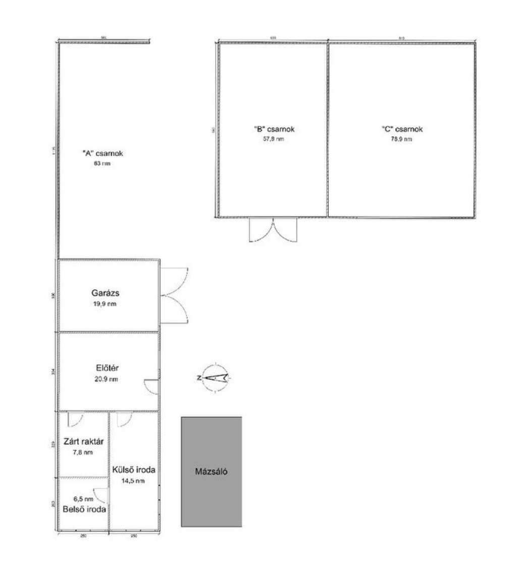 -három csarnokszerű tároló/raktárépület: 63 m2 / 57,8 m2 / 78,9 m2