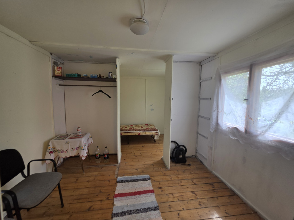 A telek hátsó felében került elhelyezésre a 18 m2-es cseh típusú faház, mely szigetelt, beton alapra épült. Elrendezése: kisebb előszoba, főzőfülke, egy nagyobb és egy kisebb szoba. A faház alatt kb. 10 m2-es beton szerkezetű, beton födémes pince található.