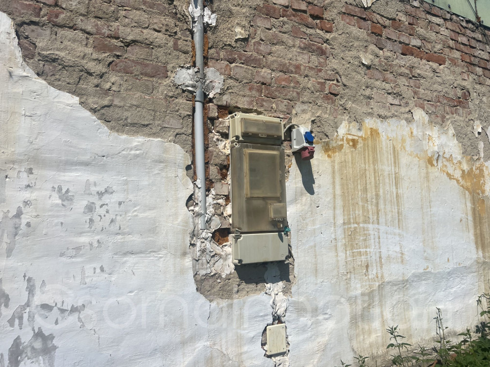 A telken van egy tető nélküli, 102 m2-es tégla építésű családi ház.