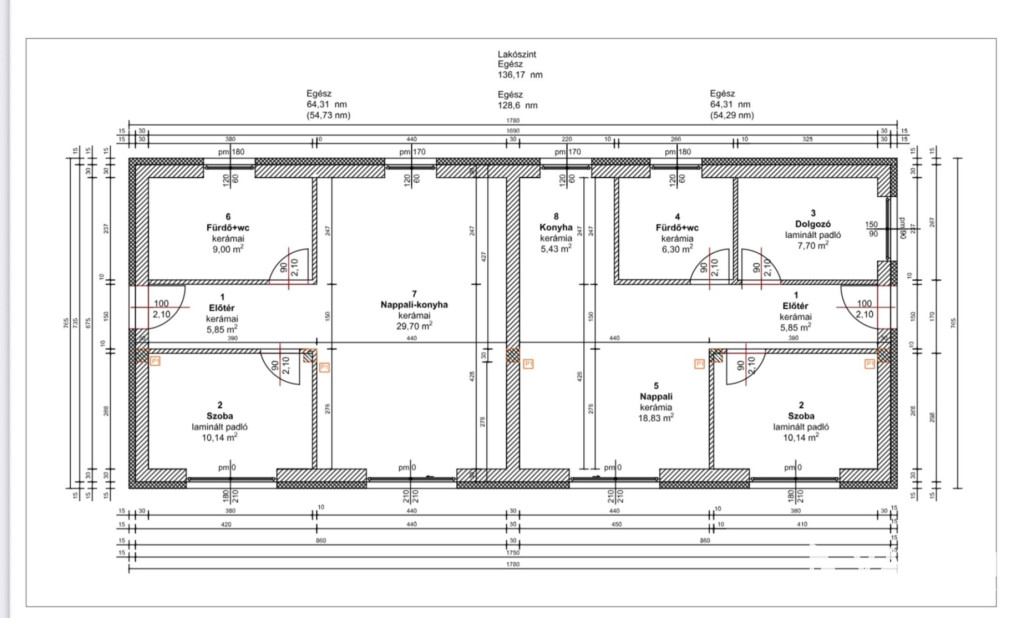 Bruttó 64,30 m2 lakásonként, nettó 55 m2 vagy 110 m2 nettó 1 lakóegység.
