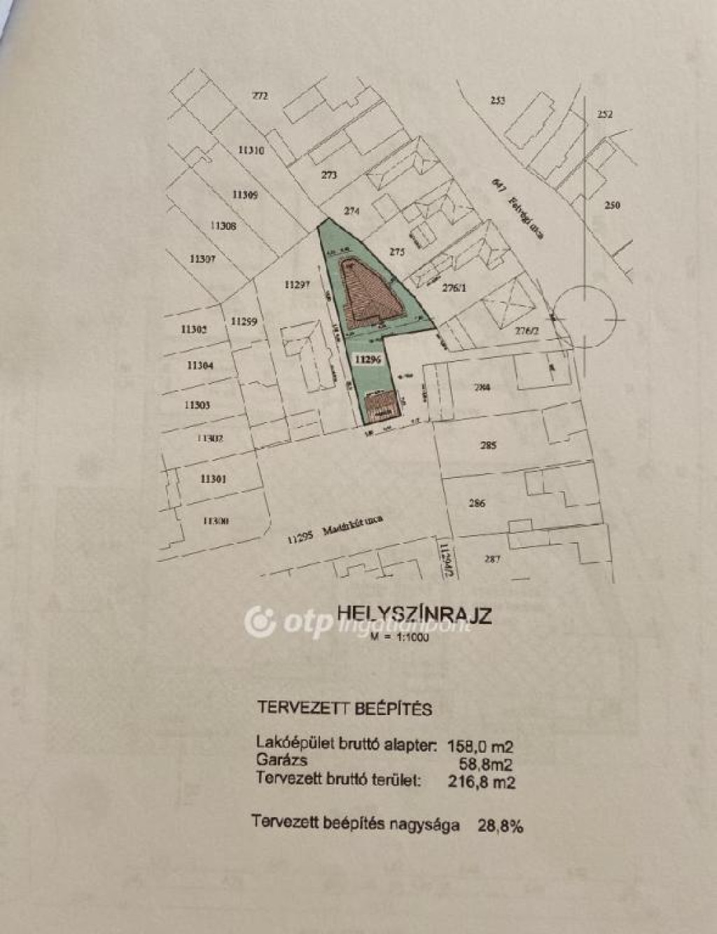 A telek alkalmas egyszintes vagy földszint + tetőtér kialakítású, szabadon álló családi ház, valamint különálló garázsépület megvalósítására. A tulajdonos rendelkezik egy elfogadott tervvel, amely egy bruttó 158 m2-es földszintes ház és egy 59 m2-es, kétállásos garázs építését foglalja magában. Komoly érdeklődés esetén a tervdokumentáció térítésmentesen átadásra kerülhet.