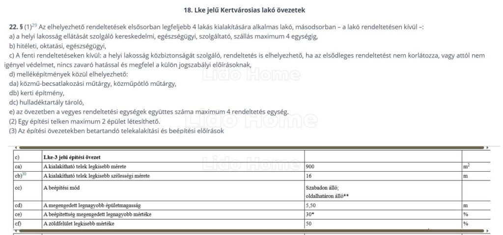 - 4130 nm-es építési telek 2 hrsz-on, kertvárosias ( Lke-3 ) lakóövezetben ahol megengedett legnagyobb beépítés 30%, legnagyobb épületmagasság 5,5 m.