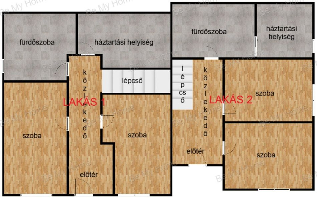 ahol található 2 hálószoba, fürdőszoba, közlekedő és a háztartási helyiség.