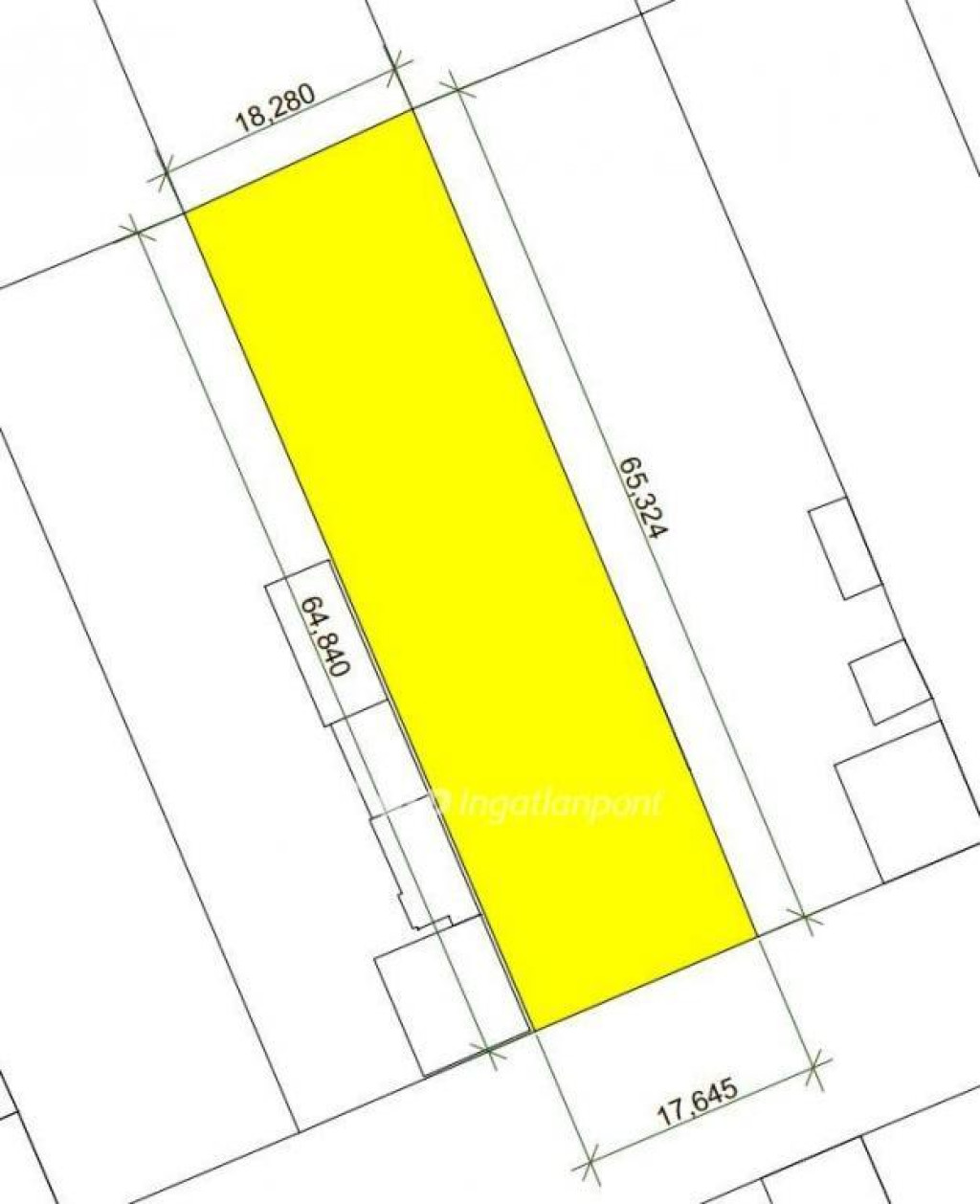 A telek utcai szélessége: 17,64 m, egyik oldala: 64,84 m, másik oldala: 65,32 m (lásd a méretezett térképet a képek között), településrendezési besorolása ún. falusias lakóövezet (Lf2), melyben a maximális építménymagasság: 4,5 m, beépíthetőség: 30%.