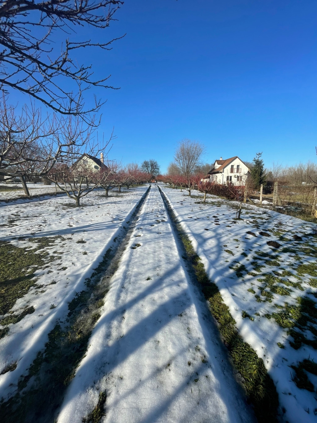 A telek két utcáról is megközelíthető, utcafrontja 14,4 méter, elhelyezkedése jól megközelíthető, mégis nyugodt környezetet biztosít. A terület kb. 100 termő gyümölcsfával van betelepítve.