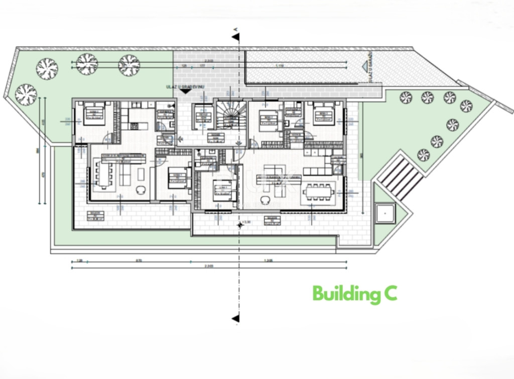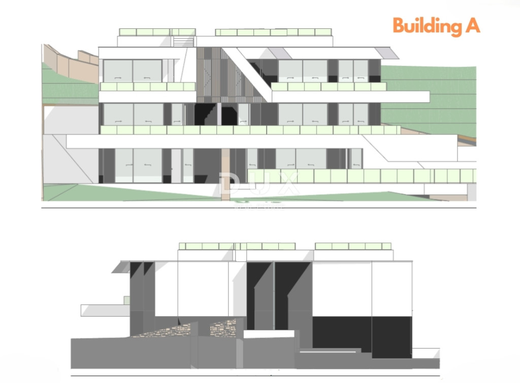 A minőségi DUX kínálatából kiemeljük az abbézi befektetési lehetőséget. Bemutatunk egy 2485 m²-es építési telket három építési telek számára Opatija központjában. Az említett építési telkek a központ feletti lakóövezetben helyezkednek el - egy csendes utcában, minőségi környéken és gyönyörű kilátással a tengerre. Az építési telek területe körülbelül 800-880 m², és már van egy felosztási terv. Telkenként hat luxuslakásból álló épület építhető garázzsal, teraszokkal és úszómedencékkel. Összesen az eladóterület körülbelül 650 m² x 3 építési telek = 1950 m² eladó négyzetméter. Ezeken a területeken az apartmanok helyett három luxusvilla építhető úszómedencével. Az apartmanok építésére már léteznek koncepciós megoldások (vizualizációk). A telkek szabályos, négyzet alakúak és enyhén lejtősek. Minden építési telek gyönyörű kilátást nyújt a tengerre, az Učka zöldje és a szabadidős túraútvonalak veszik körül őket. A telek bejárata kiváló minőségű, aszfaltúttal megközelíthető. A telek rendelkezik az építkezéshez szükséges összes infrastruktúrával, és az ügynökséggel egyetértésben az épületek további kialakítása könnyen megoldható. Ez egy nagyszerű lehetőség befektetésre és projektfejlesztésre Abbázia központjában, ahol igazi ritkaság az ilyen típusú telek. Az ingatlan megtekintésének egyeztetéséhez hívja bizalommal az ügynököt - német nyelvű konzultáció lehetséges.