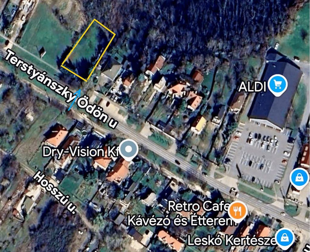 A telek arányos, téglalap alakú, az utcafront oldalon kb. 25 m széles.
