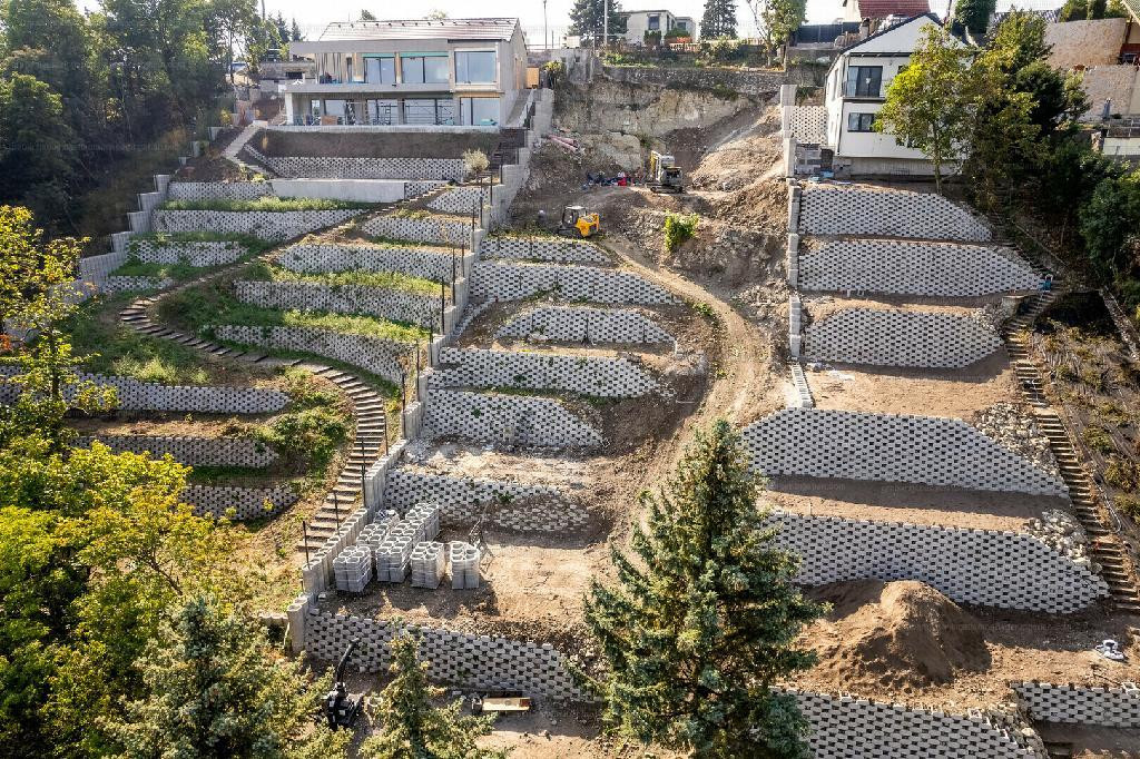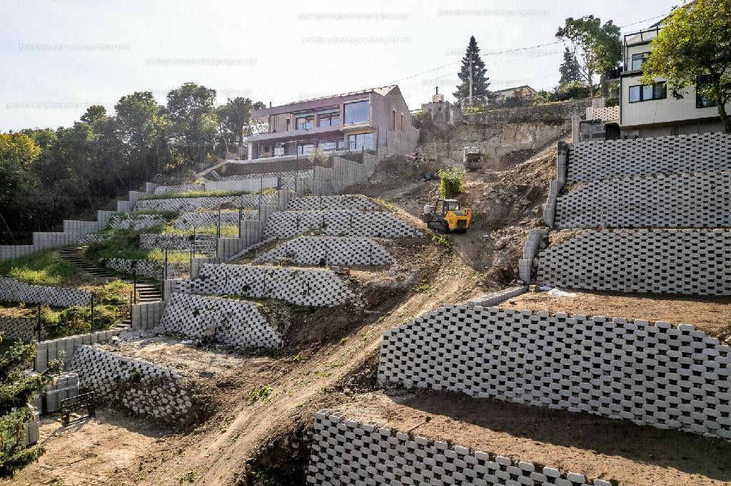 A telken támfalak kiépítéséhez részben megtörtént a hozzá kapcsolódó lépcsőzetes kialakítást is megtörtént. A földmunkák nagy része befejeződött.