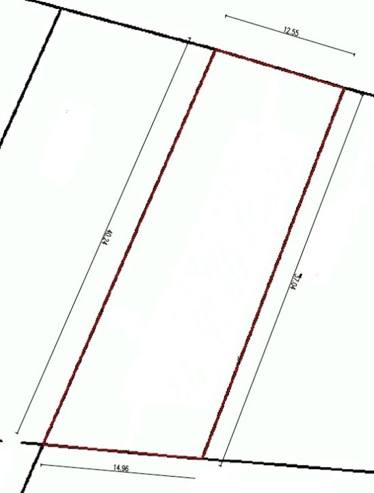 Méretei: utcafront 12,55 m ; hátsó telekhatár: 14,96 m; két oldalhatár: 37,04 és 40,24 m