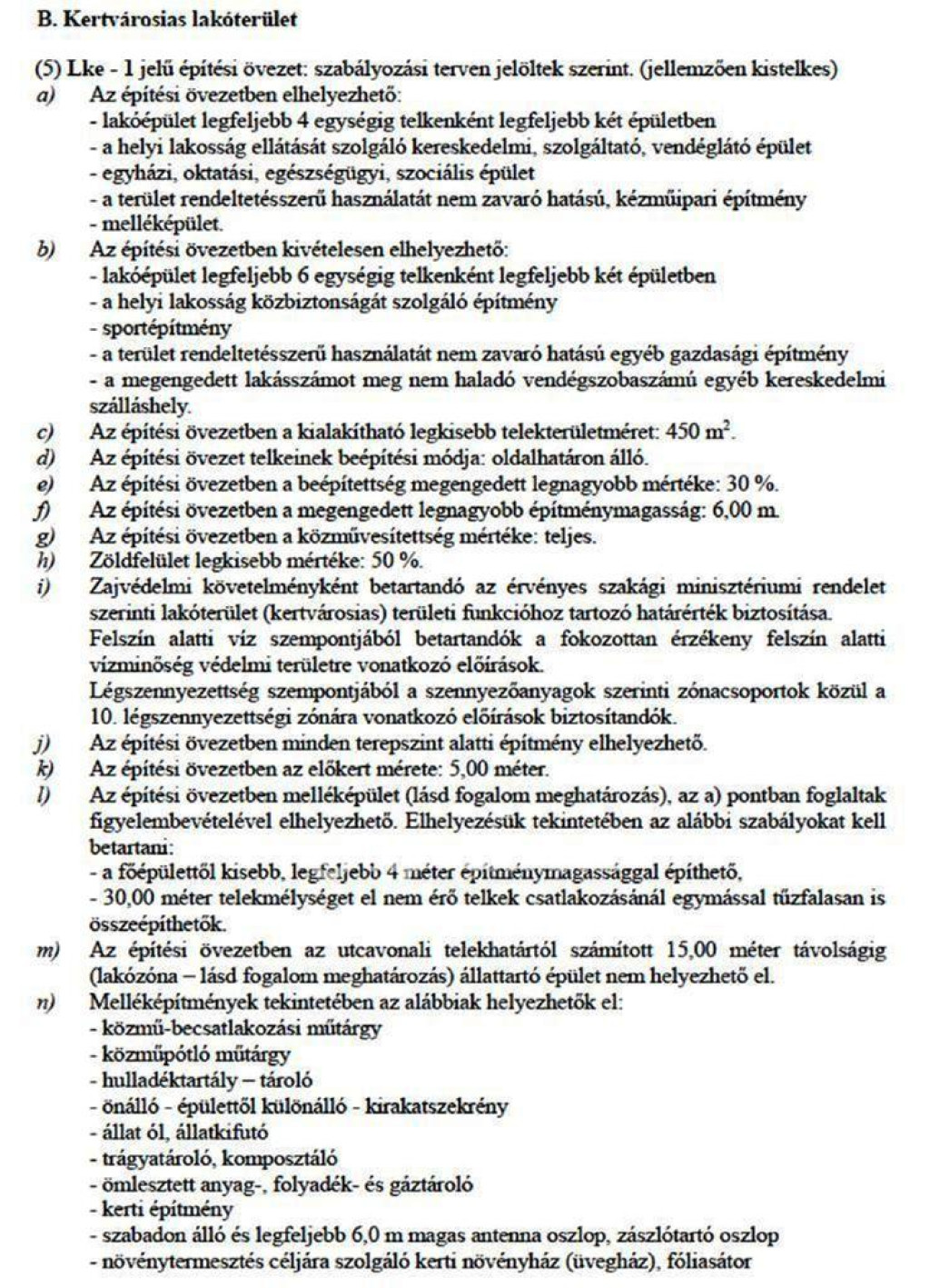 A telek településrendezési besorolása kertvárosias lakó (Lke1), melyben a beépíthetőség: 30 %, a megengedett legnagyobb építménymagasság: 6,00 m, oldalhatáronálló beépítési móddal, a telek alkalmas lakóépület építésére legfeljebb 6 egységig telkenként legfeljebb két épületben, de elhelyezhető még többek között a helyi lakosság ellátását szolgáló kereskedelmi, szolgáltató, vendéglátó épület, melléképület, egyházi, oktatási, egészségügyi, szociális épület, sportépítmény, a terület rendeltetésszerű használatát nem zavaró hatású egyéb gazdasági építmény, a megengedett lakásszámot meg nem haladó vendégszobaszámú egyéb kereskedelmi szálláshely is. Az építési övezetben HÉSZ előírásokat bővebben lásd a képek közötti kivonatban.