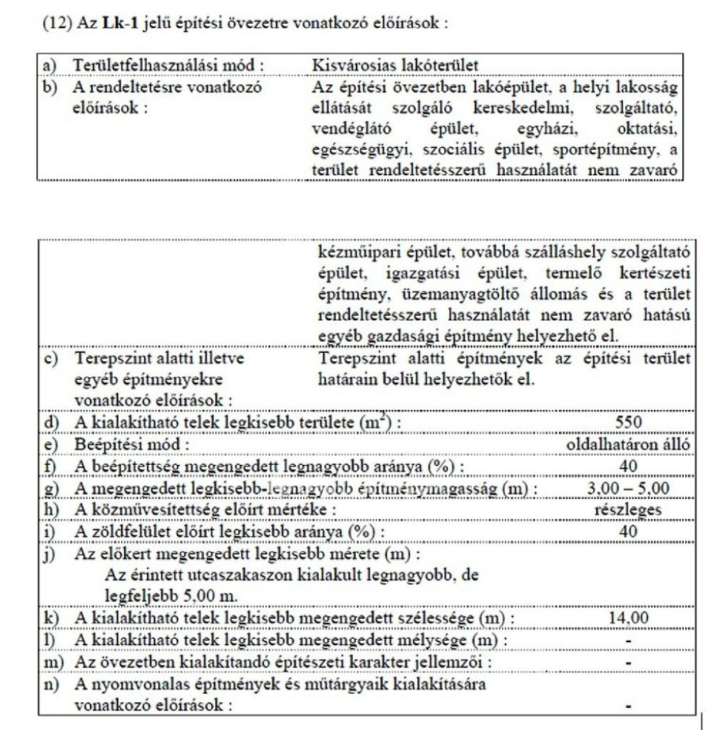 A telek településrendezési besorolása kisvárosias lakóövezet (Lk1), melyben a beépíthetőség: 40 %, a minimális építménymagasság 3 m, megengedett legnagyobb építménymagasság: 5 m, oldalhatáronálló beépítési móddal, a telek alkalmas lakóépület építésére, de elhelyezhető még többek között: szálláshely szolgáltató épület, kereskedelmi, szolgáltató, vendéglátó épület, mező- és erdőgazdálkodási üzemi építmény, helyi igazgatási, egyházi, oktatási, egészségügyi, szociális épület, sportépítmény. Az építési övezet HÉSZ előírásait bővebben lásd a képek között (kivonat).