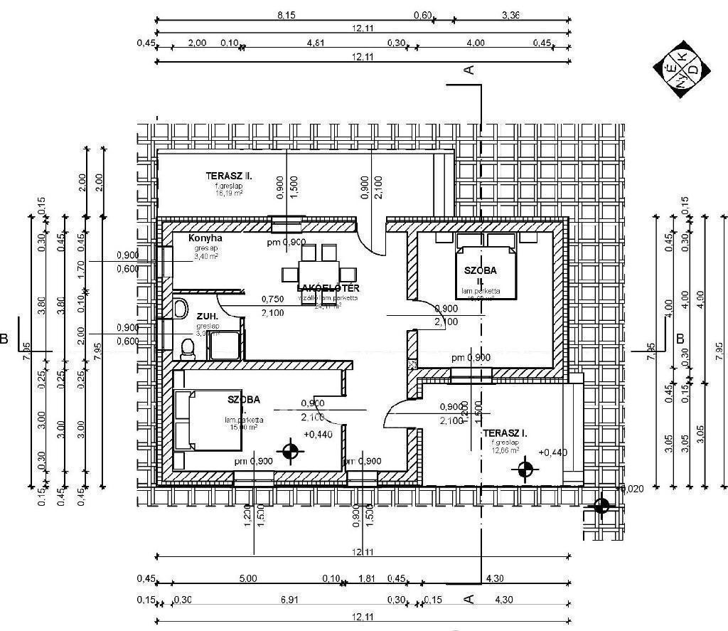 Helyiségek: nappali-konyha-étkező, 2 szoba, zuhanyzós fürdő (WC-vel egyben), két terasz 28,85 m2.