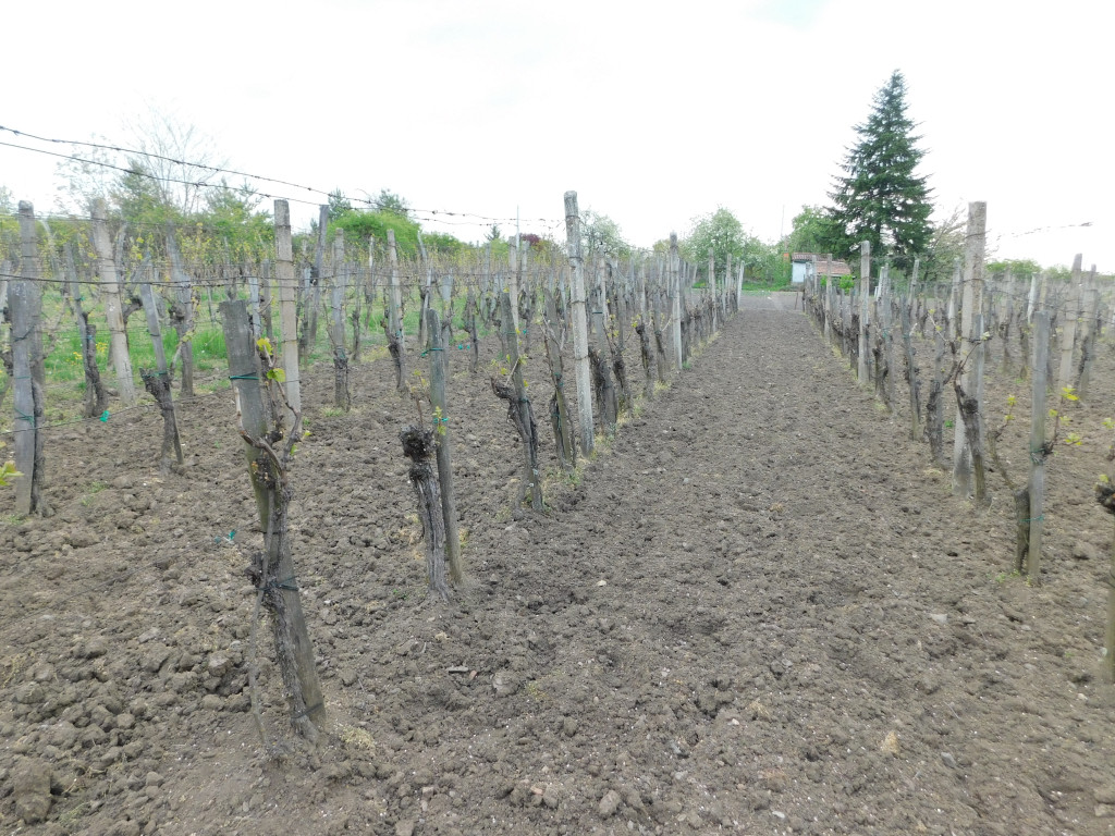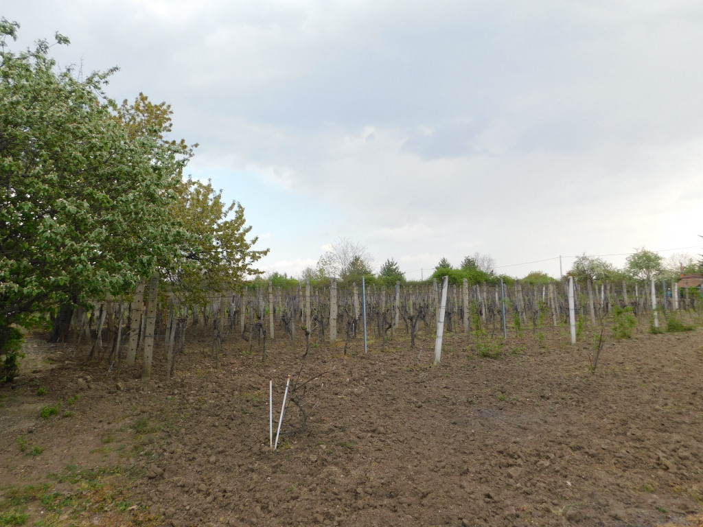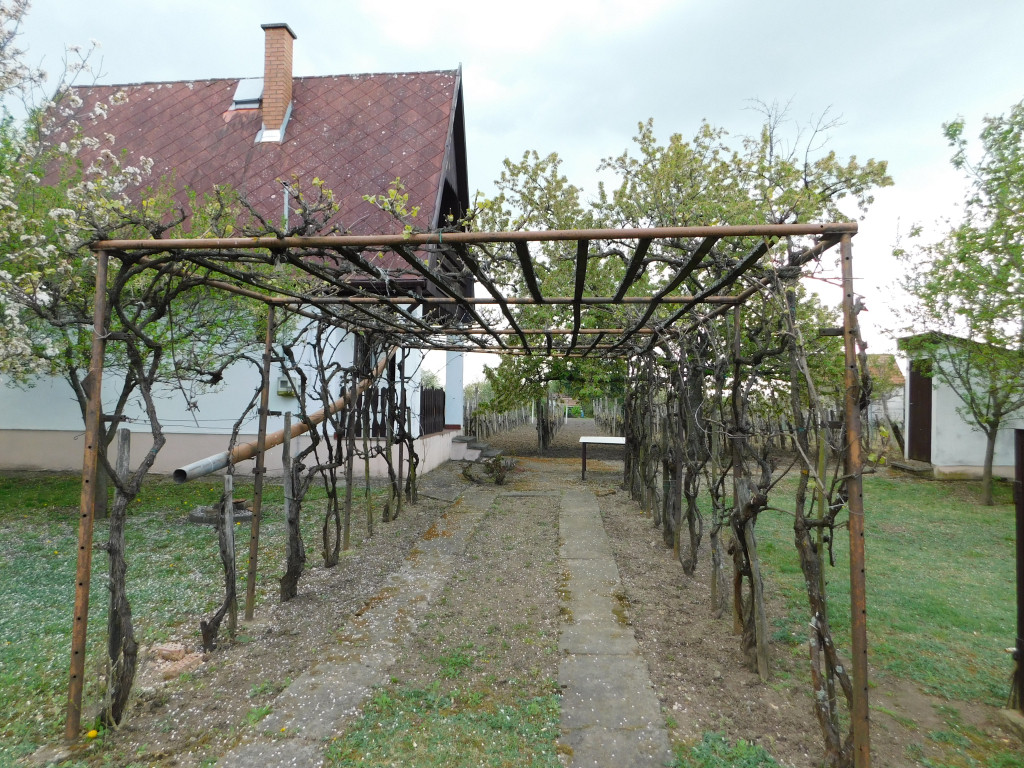 - a kertben termő gyümölcsfák és gondozott szőlő található