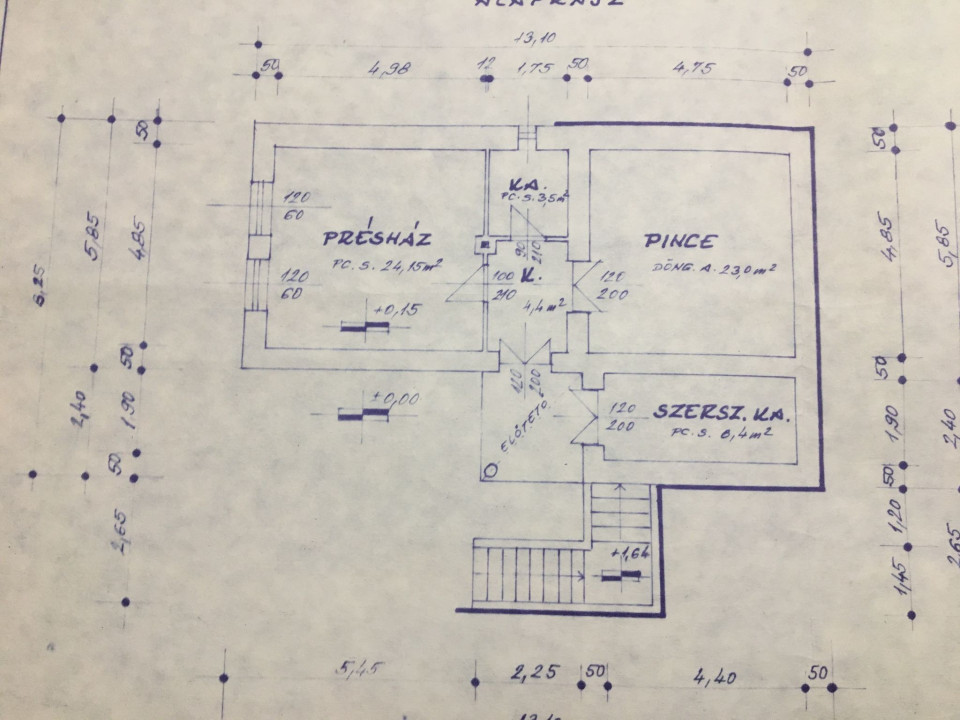Szuterén alapterülete 55,55 m2: présház 24,15 m2, pince 23 m2, szerszámtároló 8,4 m2 +különálló tároló és wc, az épület mellett
