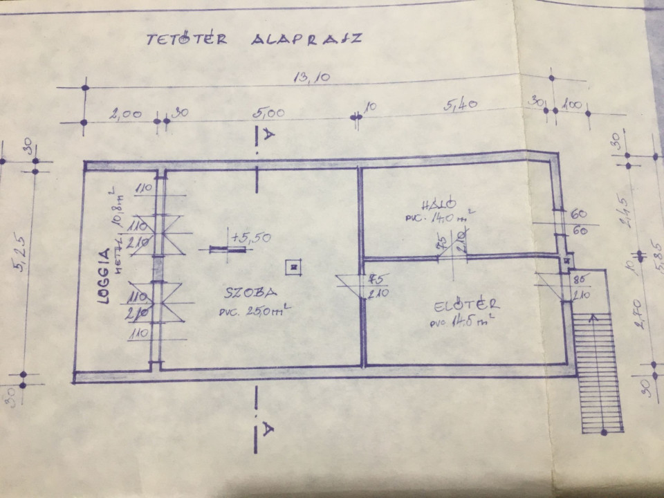 Tetőtér nettó alapterülete 64.3 m2: 2 szoba 25 m2, zuhanyzó, wc, konyha (14 m2), előtér 14,5 m2, loggia 10,8 m2