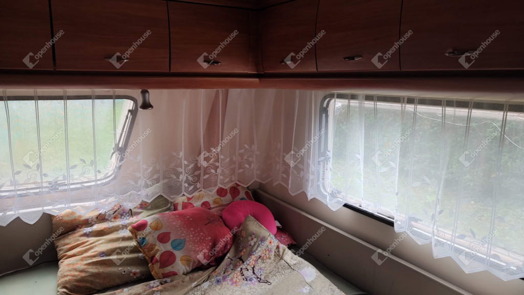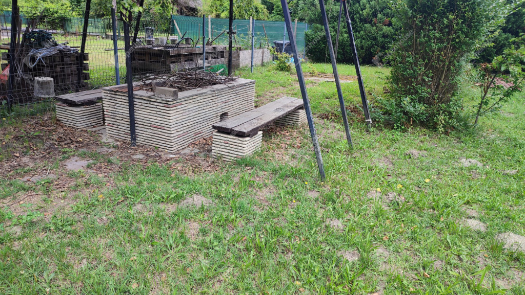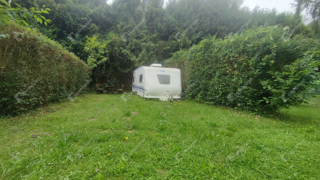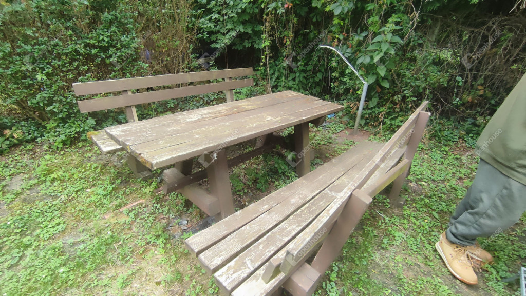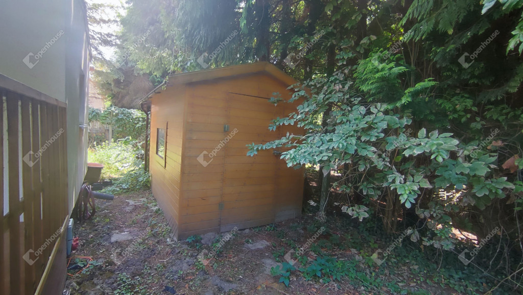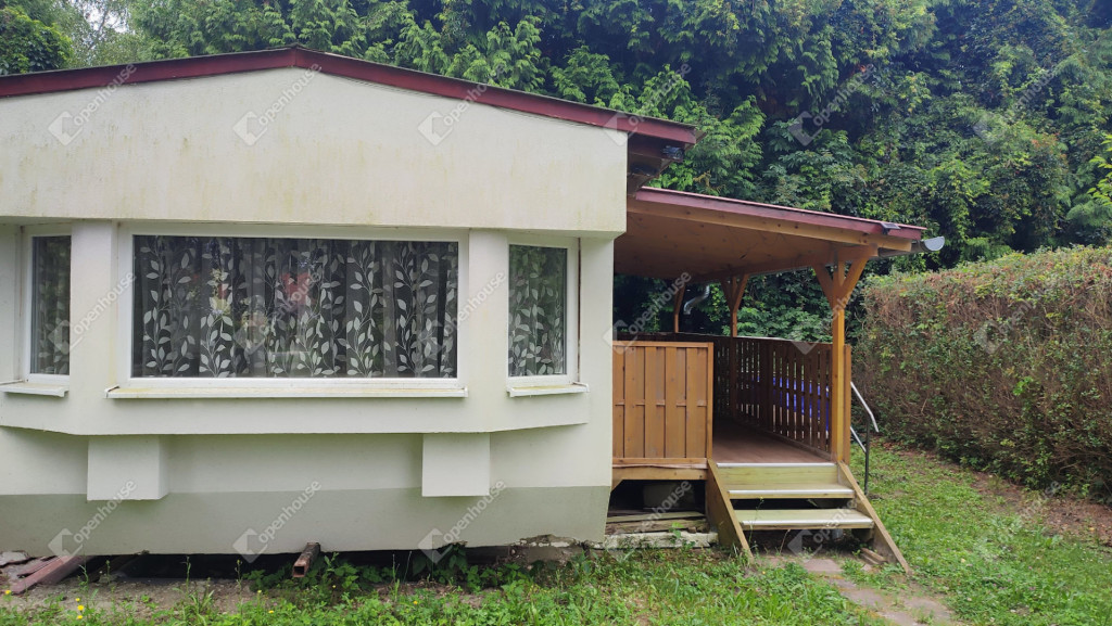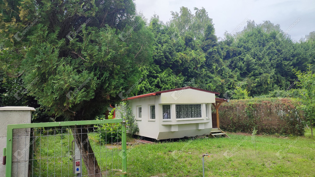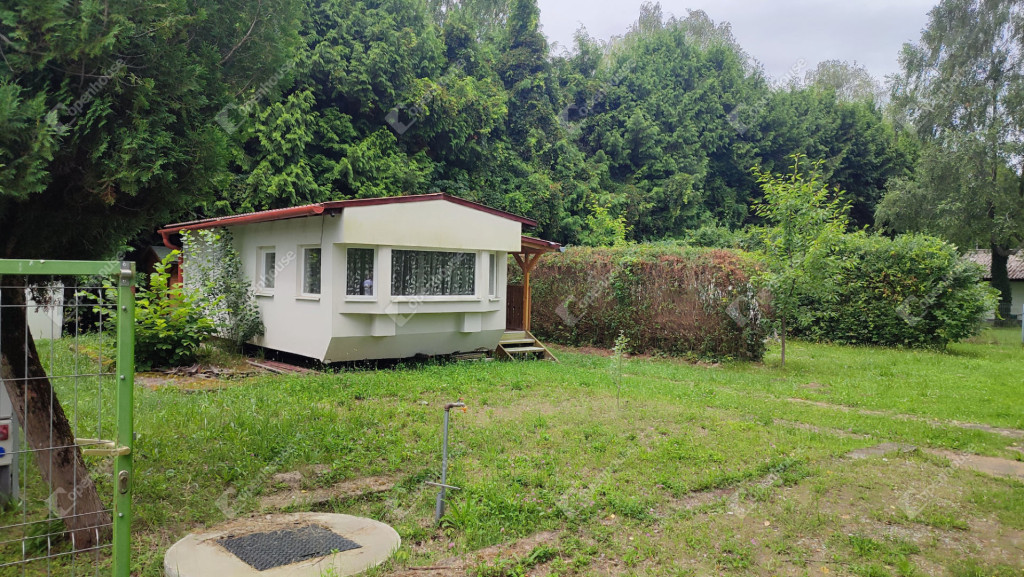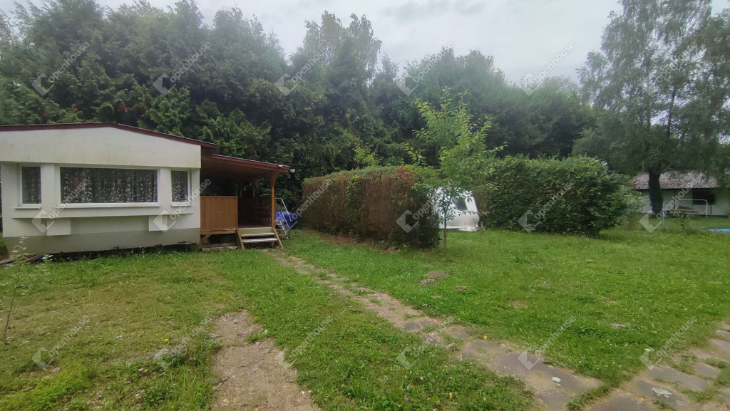 A rajta lévő szendvicspaneles, szigetelt épület 27-négyzetméteres. Egy szobát ,nappalit, konyhát, fürdőszobát valamint nagyméretű kiülős fedett teraszt foglal magába. Fűtéséröl infrapanel gondoskodik így egész évben használható a ház. Nyílászárók szintén szigeteltek. Udvara parkosított , ahol kőből épített szalonnázó-grillező is helyet kapott. Különálló igényes, fából készült szerszám tároló a ház mögött. Valamint egy Hobby típusú minden igényt kielégítő lakókocsi extra belsővel. Ha több helyre lenne szükség.
