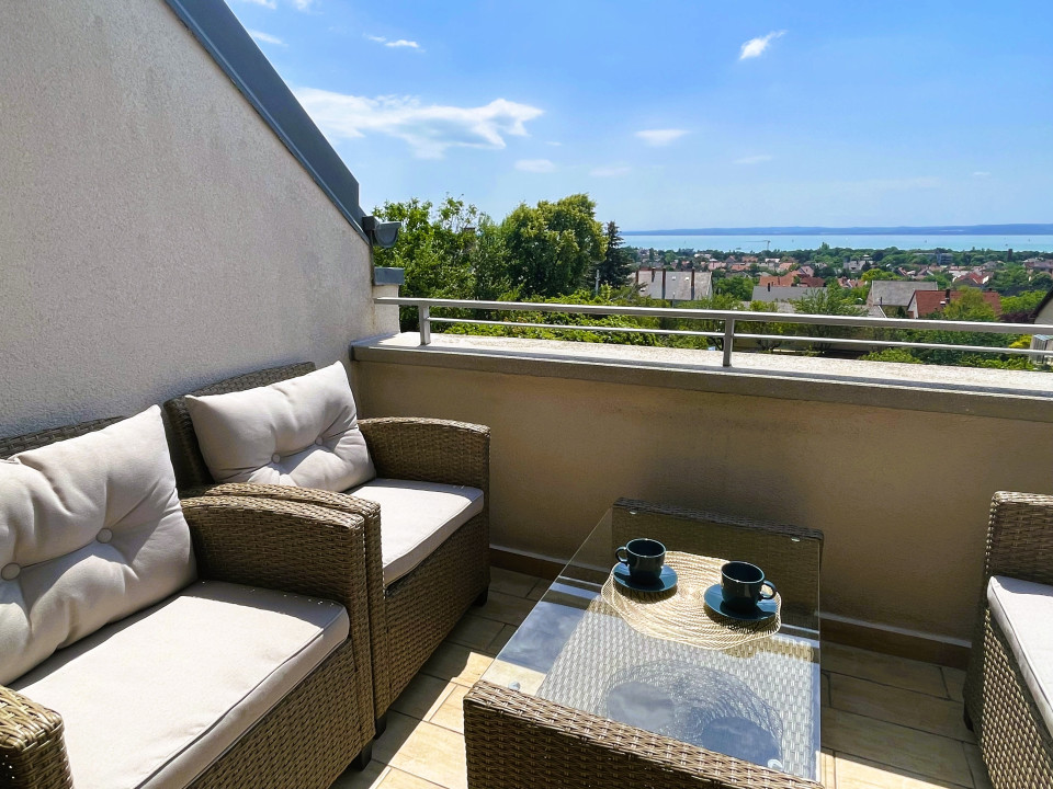 3 szinten 6 különálló lakrész, mindegyikhez saját konyha, fürdőszoba és 1, illetve 2 hálószoba tartozik erkéllyel és elvehetetlen balatoni panorámával.