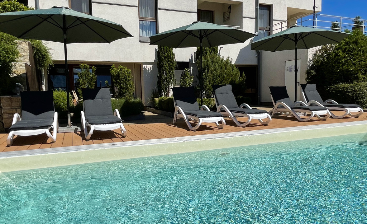 3,5*8 méteres fűthető, kültéri medence WPC napozóterasszal, plexi fedéssel, automata vegyszeradagolóval.