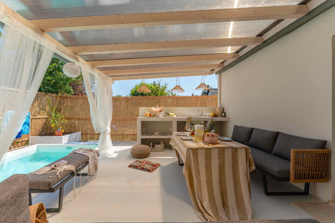 - felszerelt kinti konyha hűtővel, mosogatóval