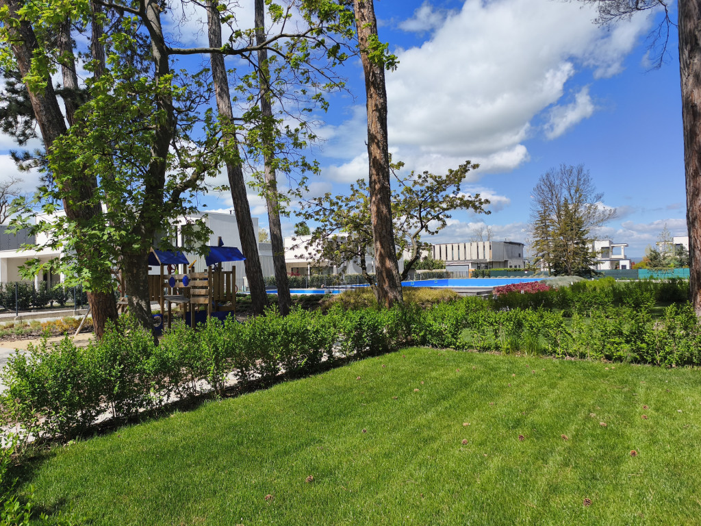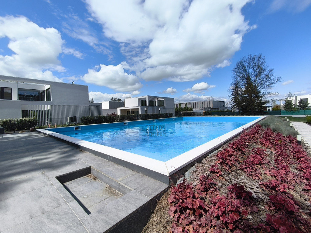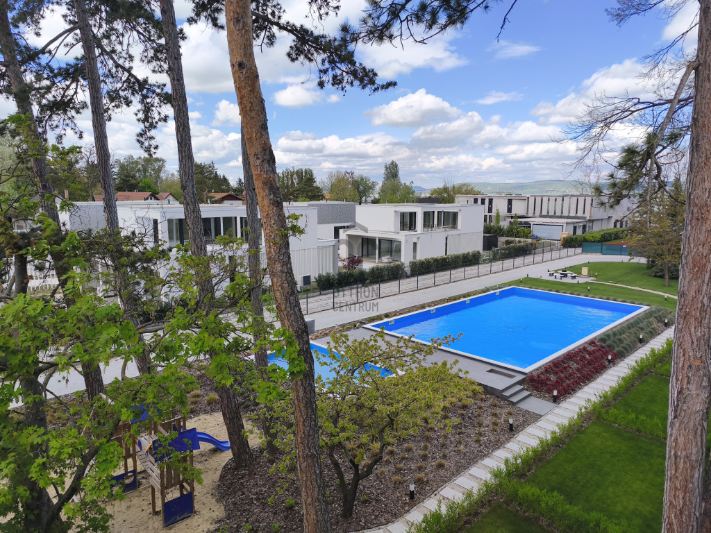 A lakás 29 lakásos, A+ energia besorolású társasházban található, a 2. emeleten, a penthouse szinten. Az épület tervezésénél a funkcionalitás mellett fő szempontok voltak az egyszerűség, az elegancia, a harmónia és a modernitás, ezek mellett a kedvező megközelítés, tájolási és panoráma adottságok kihasználása is. A lakóparkban felnőtt illetve gyermek medence is kialakításra került. Az ingatlan téglából épült, szigetelt, lapos tetős épület.