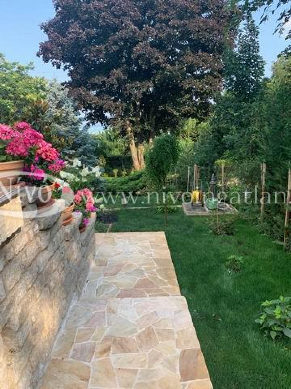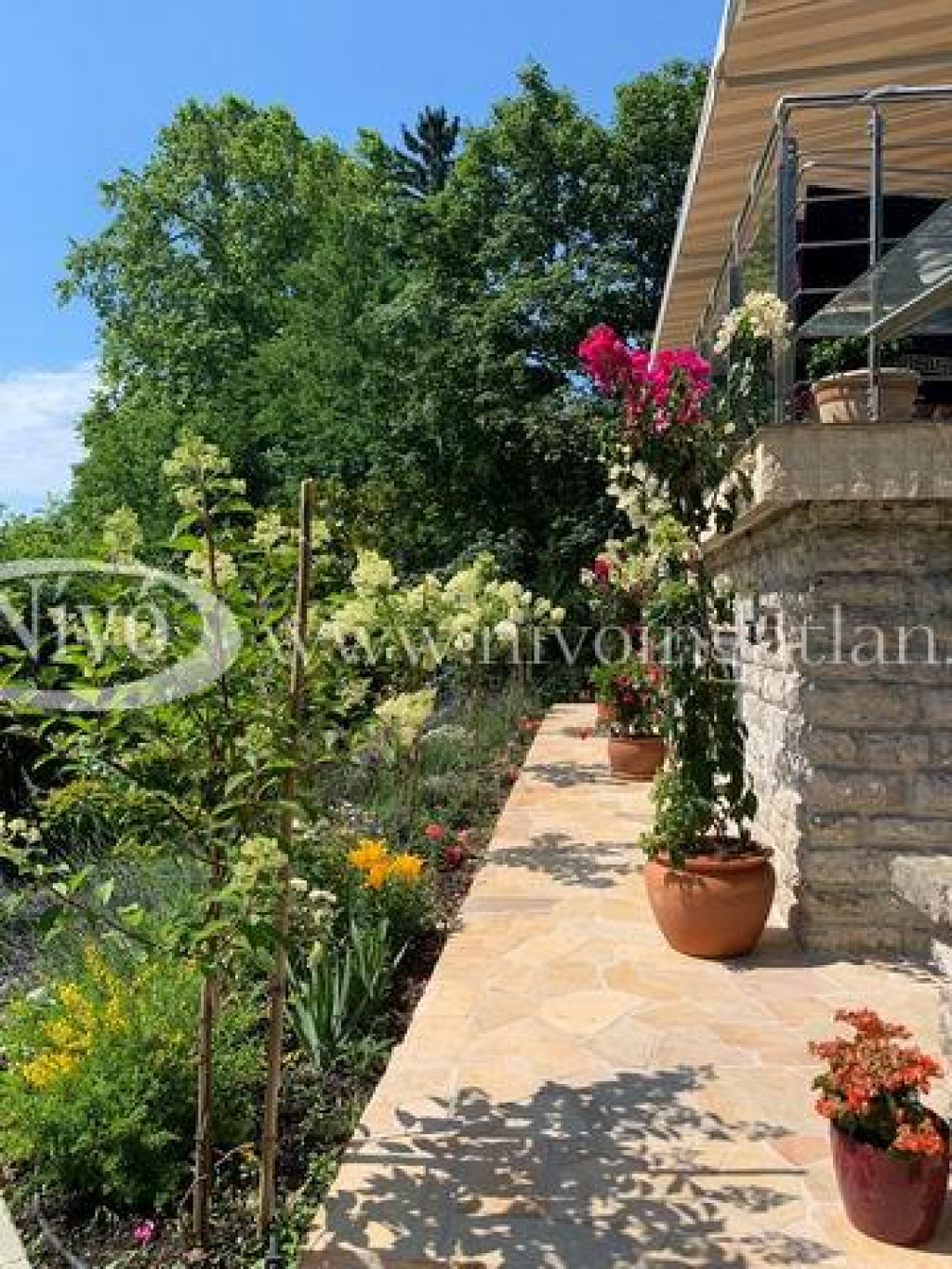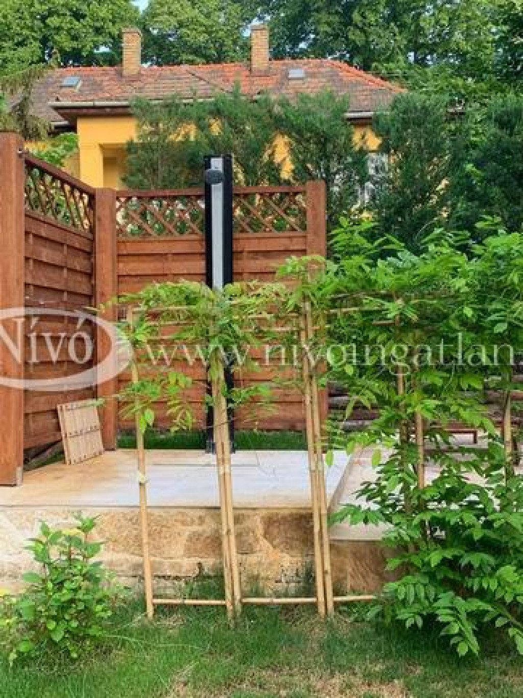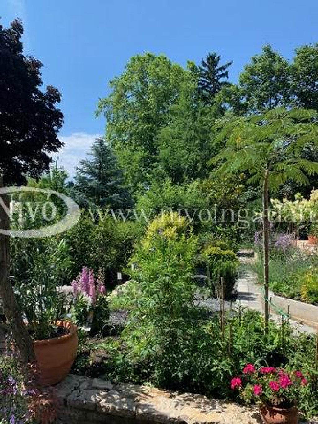 Az ingatlan 949 m2-es elektromos kapuval ellátott, körbekerített, parkosított, több mint 100 féle növénnyel beültetett (mediterrán növények, ritka fák, veteményes-és fűszerkert) gondosan karbantartott telken helyezkedik el, ahol kialakításra került egy hangulatos, teljesen felszerelt, gépesített, 21 m2-es nyári konyha, egy 24 m2-es kocsibeálló illetve több autó számára viacolor térkővel burkolt kocsibeálló is illetve még kerti zuhanyzó, bográcsozó-grillező és egy tároló kamra is megtalálható. A kertben van még fúrt kút és a locsolórendszer is ki van építve.