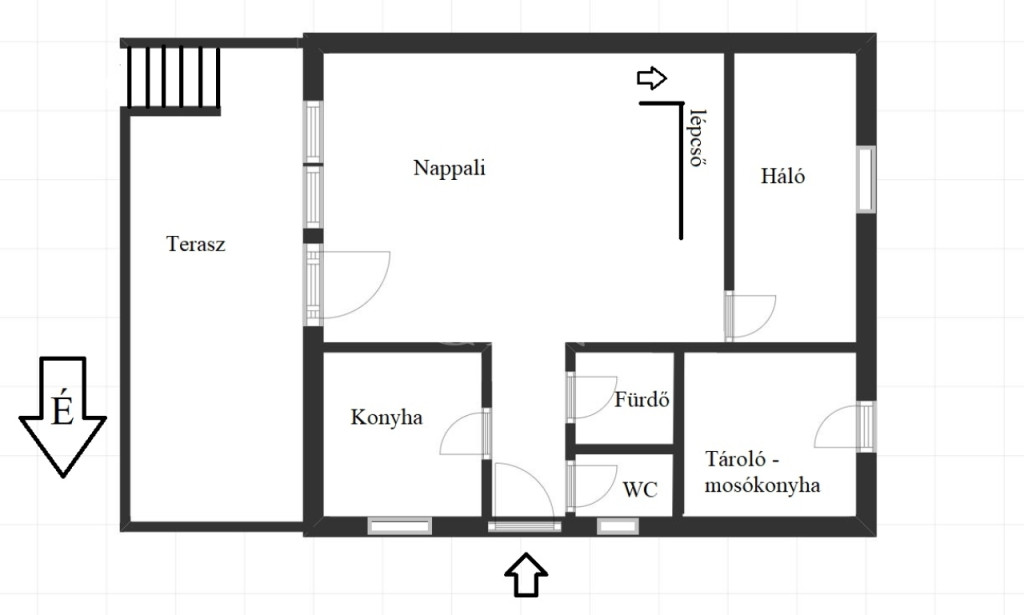 Jelenleg a földszinten nappali, hálószoba, konyha, fürdőszoba és külön WC, az emeleten hálószoba (12 nm) és fürdőszoba található. Emeleten is található egy 8 nm-es erkély, a kert szintjén pedig egy 16 nm-es terasz épült.