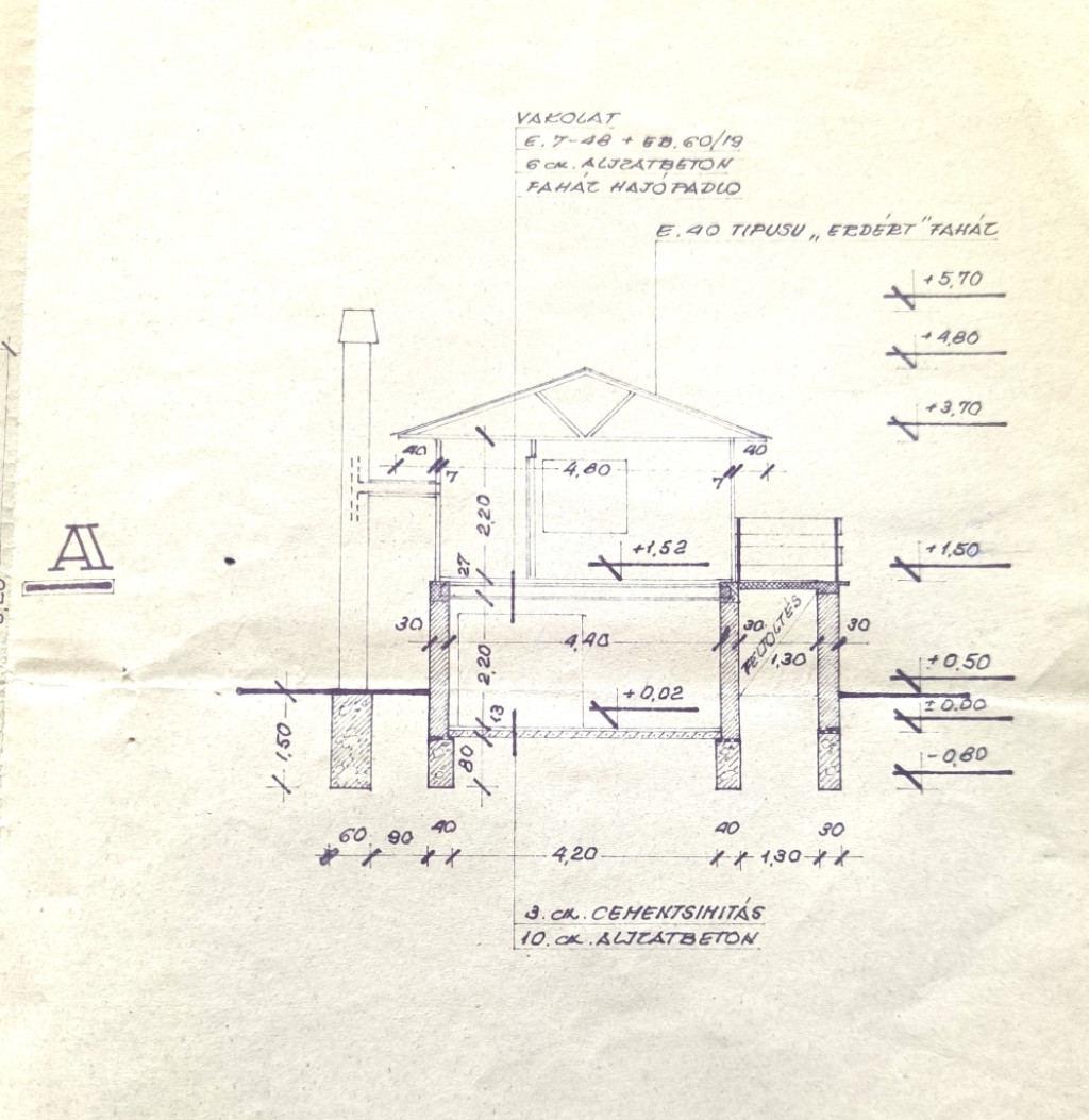 Bánk tó közeli utcájában eladó, E40 típusú 40 nm-es Erdért faház (+10 nm terasz, + 50 nm pince) , 568 nm-es telken.