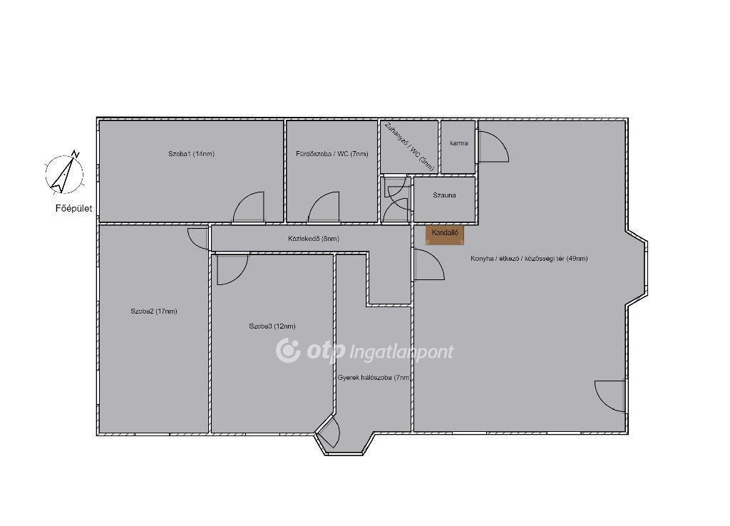 Az épület első részén található bejáraton a házba belépve egy 49nm-es közösségi térbe érünk, aminek egyik részén amerikaikonyha / étkező található, a konyhához kamra tartozik. A szobák egy 8 nm-es közlekedőből nyílnak, melyek alapterülete 12, 17, 14nm. A 12nm-es szobából nyílik még egy 7nm-es, jelenleg gyerek hálószobának használt félszoba. Visszatérve a közlekedőbe nyílnak a mellékhelyiségek két fürdőszoba / wc, valamint a feltöltődésre kialakított szauna helyiség.