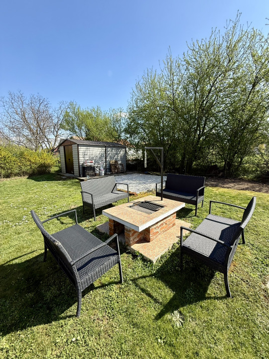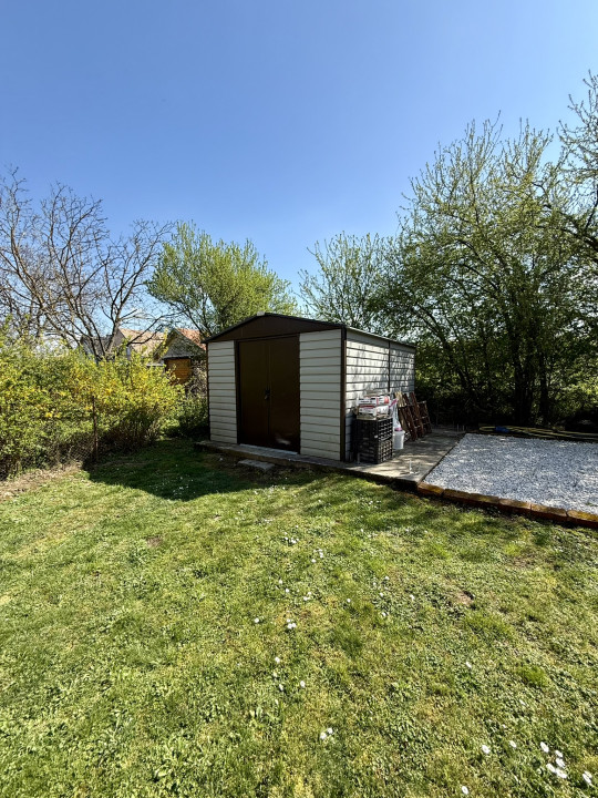 A házhoz tartozó 350 m2-es rendezett kertben egy praktikus tároló is várja, hogy megkönnyítse az új tulajdonosa mindennapjait.