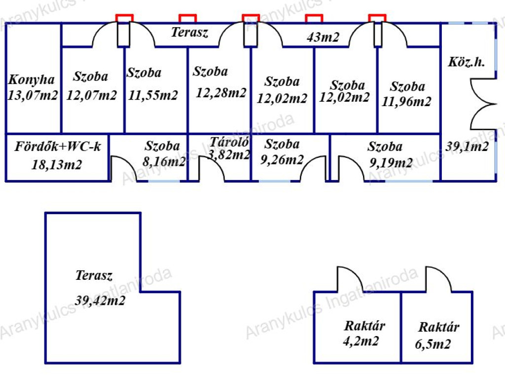 Az ingatlan elrendezése: 8 különálló szoba, konyha, nagy közösségi helység, 4 WC, 2 fürdőszoba, valamint raktár- és tárolóhelyiségek.