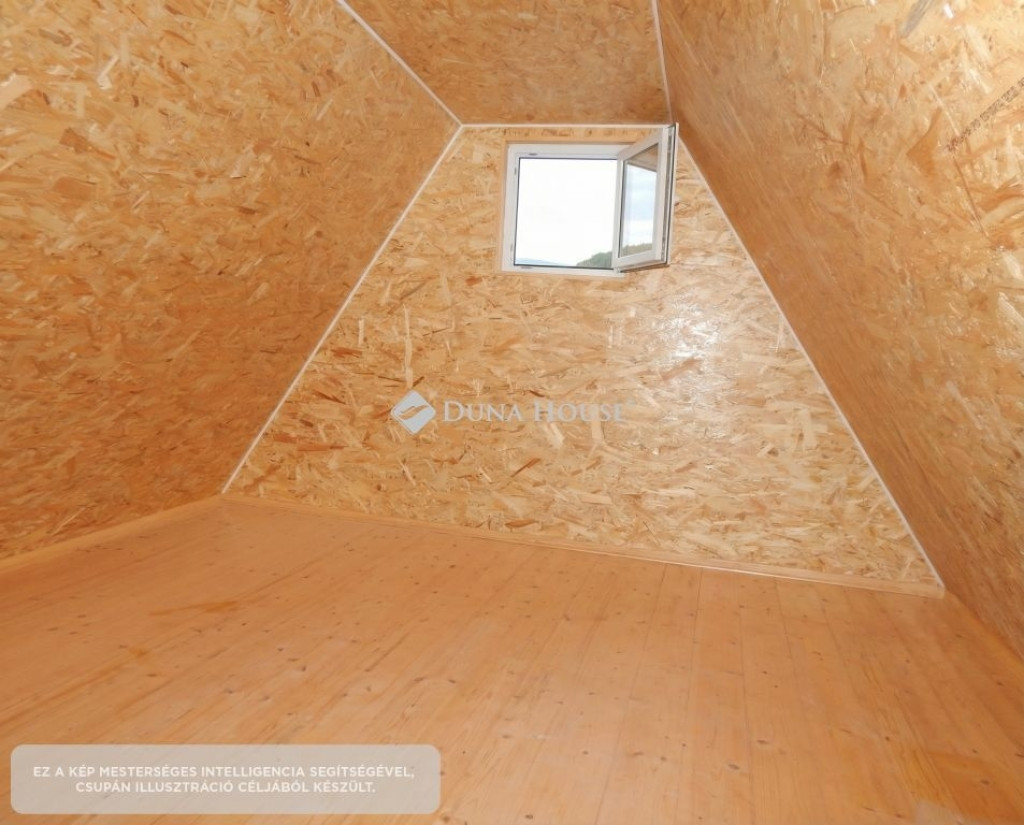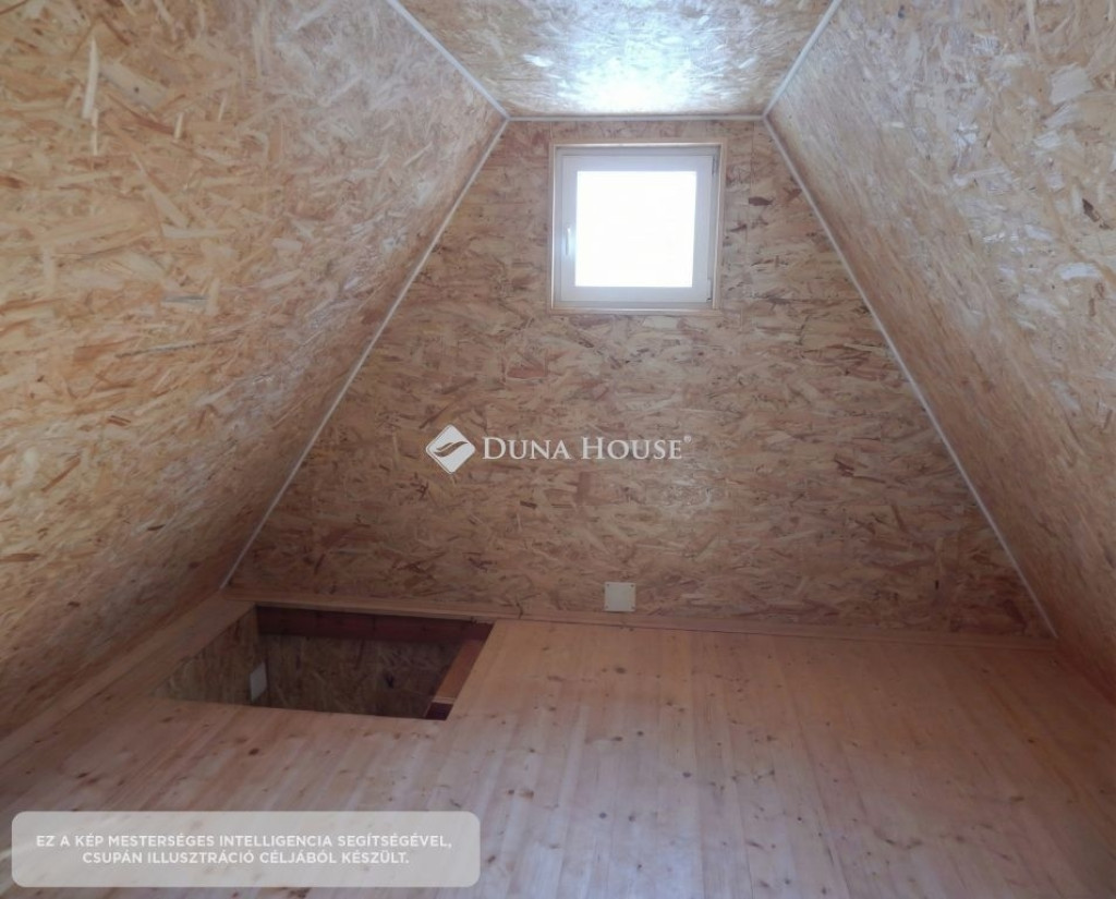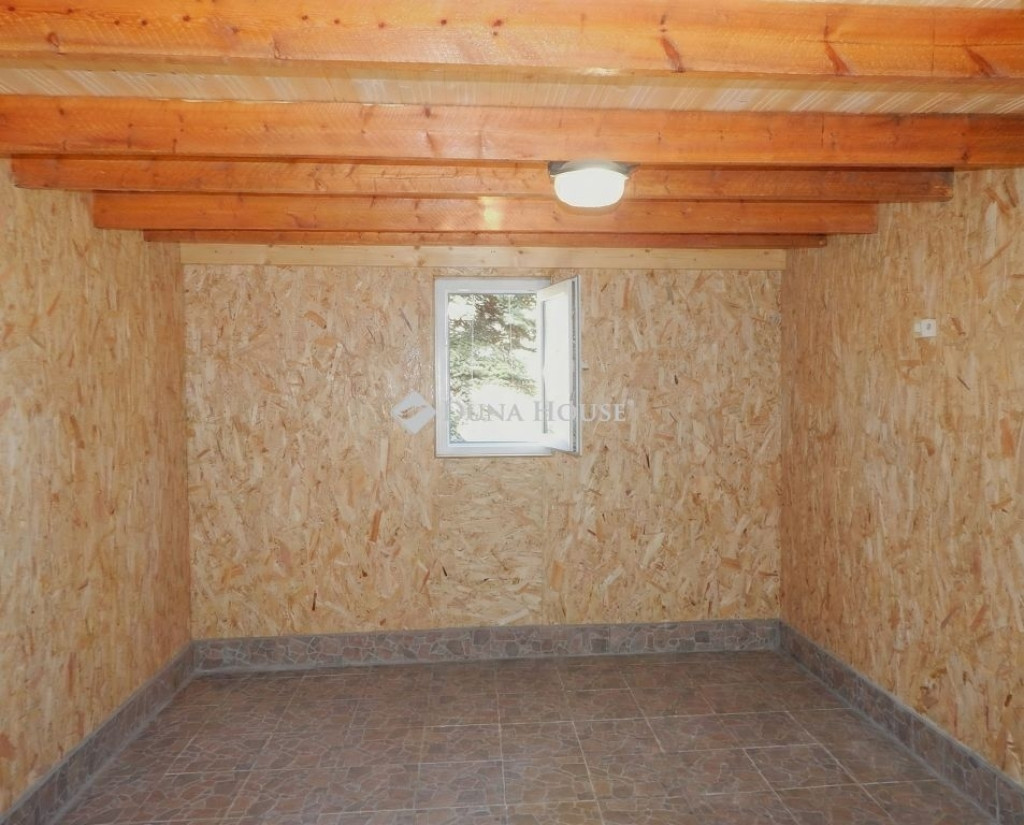 A tetőtér beépítéses házacska nettó 2x11 m², amelyhez 6,5 m² fedett terasz kapcsolódik. Az épületbe nincs víz bevezetve, a wc külön kis épületben található, amely fa szerkezetű, és másik oldala egy fás fészernek is helyet ad.