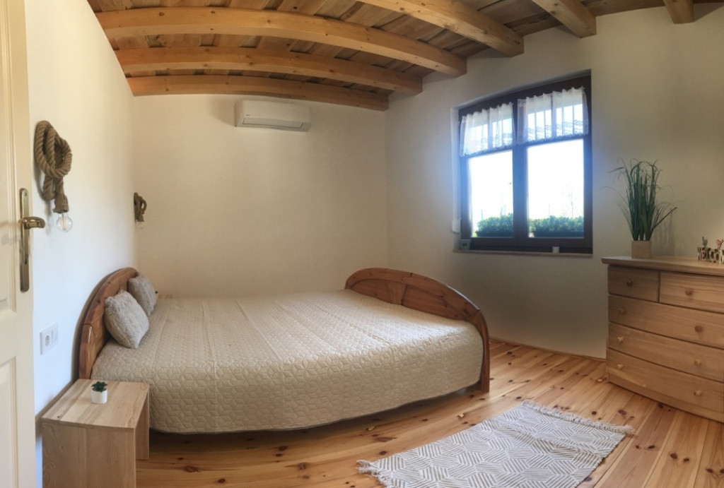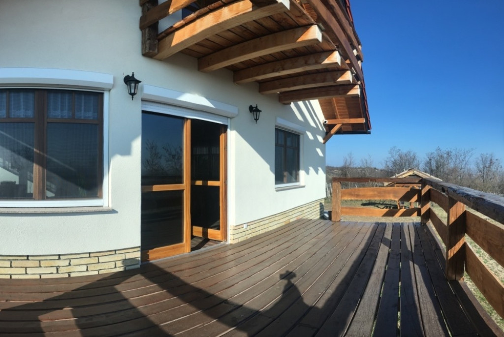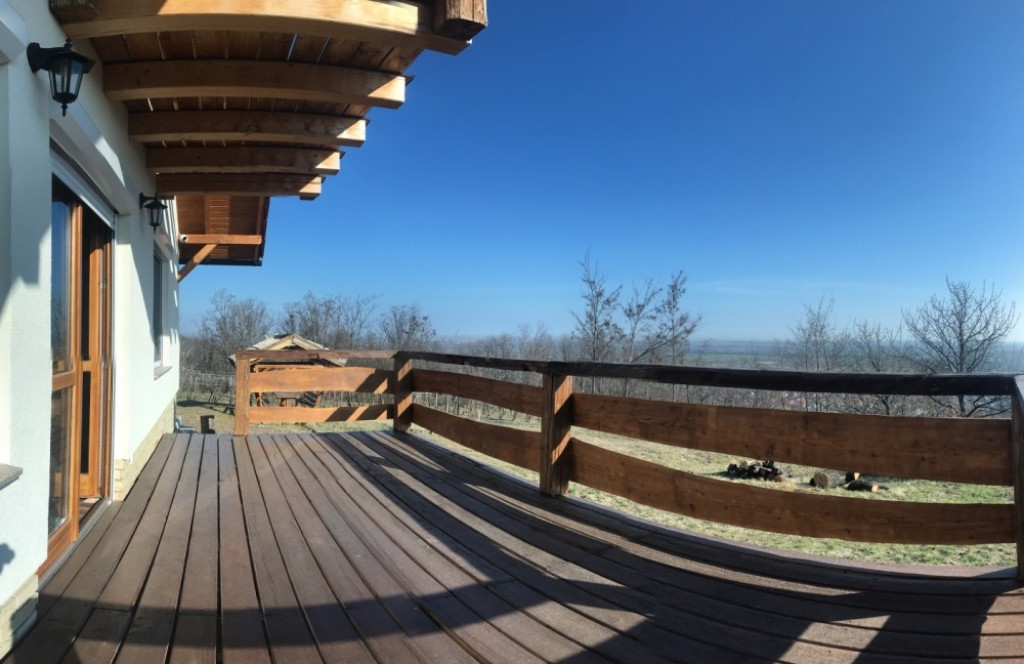 Győrújbarát festői szépségű, Pannonhalmi Apátságra tekintő csendes részén, nyugodt környezetben, 2206 m2-es telken lévő, amerikai konyha – étkező – nappali + 3 hálószobás, 95 m2 hasznos alapterületű, kiváló állapotú, KLIMATIZÁLT családi ház/hétvégi ház/nyaraló/zártkert, 22,26 m2-es TERASSZAL, 6,18 m2-es ERKÉLLYEL, 20,53 m2-es kétállásos fedett gépkocsi beállóval és PÁRATLAN, PANORÁMÁS kilátással eladó.