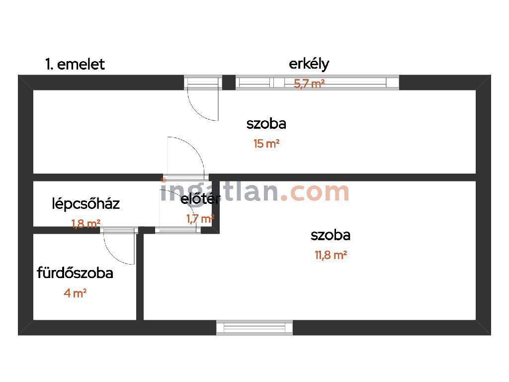 Emelet: 2 szoba, előtér, fürdőszoba.