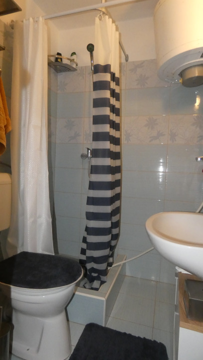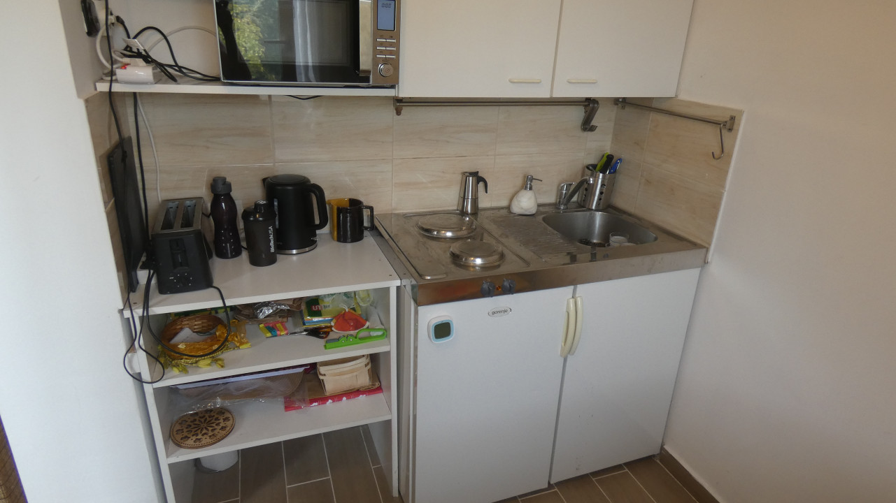 A K -i tájolású apartmanban - a fentieken kívül - egy étkezős, hűtővel, mosogatóval felszerelt konyha, egy zuhanyzós, villanyboyleres fürdő/wc és egy nagy,