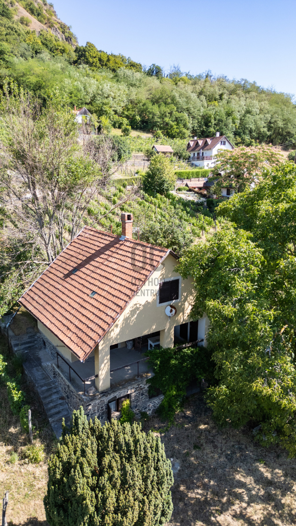 The lower level has a preparation room, wine cellar, storage and kitchen. The upper level has 2 spacious living rooms with high ceilings, a bathroom with shower and a toilet, all accessible from the covered terrace. The terrace can be converted into a living room with views. The rooms have 1-1 beautiful tiled stoves. All rooms are bright, with windows, and the sun shining on Lake Balaton can be seen from the inside too.