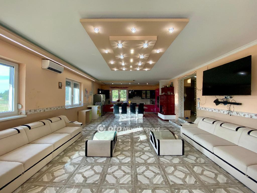Bács-Kiskun Vármegye külterületi részén eladó egy 230 m2-es igényesen megépitett családi ház. Az ingatlanhoz 12 079 m2-es terület tartozik, melyből az ingatlan-nyivántartás kivett lakóház udvar megnevezésű részhez 400 m2-es terület tartozik, a többi szántó megnevezéssel szerepel a tulajdoni lapon. A z ingatlan 2021-ben kapott Használatbavételi engedélyt. A családi házban 5 szoba, egy hatalmas nappali, konyha, kamra, közlekedő, fürdőszoba, WC, padlásfeljáró került kialakitásra. Az ingatlan jellemzői: téglából épült 38-as téglafal, 20 cm-es szigetelés, beton födém E dupla gerendával. Az ácsolt tető beépithető, héjazata cserép. A tetőtér beépithetőségének köszönhetően további lakóhelyiségek kialakitása lehetséges. Az ingatlanban 5 db. klima került felszerelésre, valamint az otthon melegéről gáz-cirkó kazán padlófűtéssel gondoskodik. Az elektromos áram 3X32 A , melynek köszönhetően minden elektromos berendezés kiválóan működik. Az ingatlanba minőségi nyilászárók kerültek beépitésre, az ablakok 3 rétegű üveggel, 6 légkamrás megoldással, aluminium redőnnyel felszereltek. A telekre 40 kw napelemrendszer kiépitése történt, igy a megújuló energiaforrásnak köszönhetően az ingatlan rezsije nagyon alacsony. A ház alatt elhelyezkedő garázshoz szekcionált garázskapu tartozik. Az udvaron található egy 90 méter fúrt kút. Extra felszereltség az ingatlan védelmében a teljes riasztórendszer kiépitése. eljes körű és díjmentes CSOK Plusz, Lakáshitel, Babaváró kölcsön, Otthon Start lakáshitel és egyéb banki termékek ügyintézésével állunk rendelkezésére sorban állás nélkül! Az adásvételi szerződéshez megbízható ügyvédi hátteret biztosítunk. Megtekintésért kérem hívjon bizalommal! Eladó ingatlana van? Szívesen segítek az értékesítésben!
